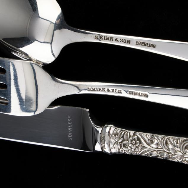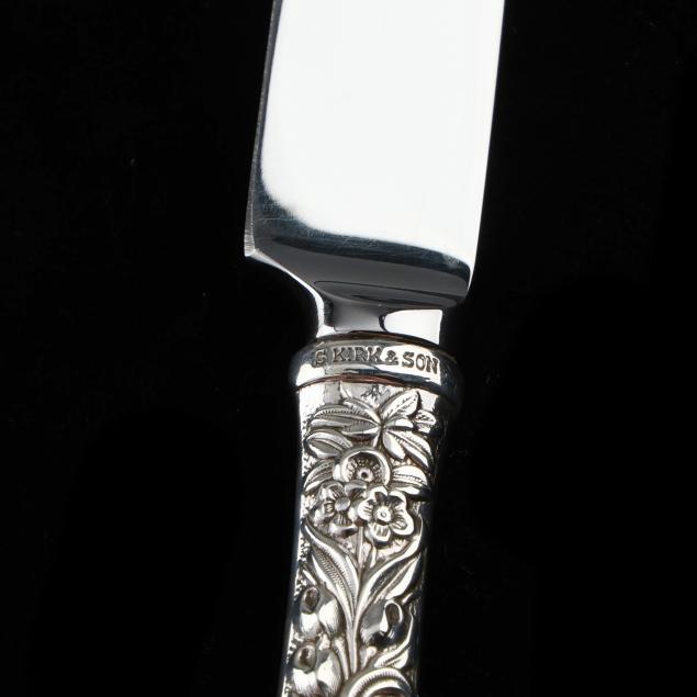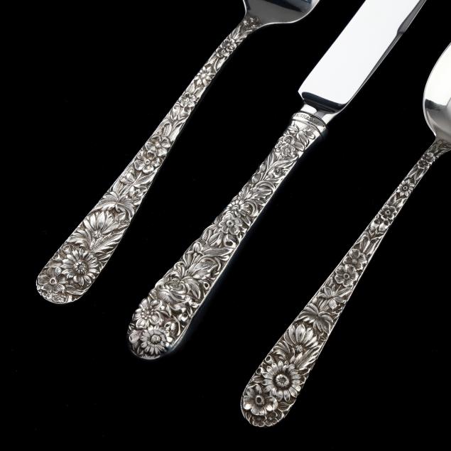 Includes a spoon, fork, and knife, with hand chased foliate handles, not monogrammed.