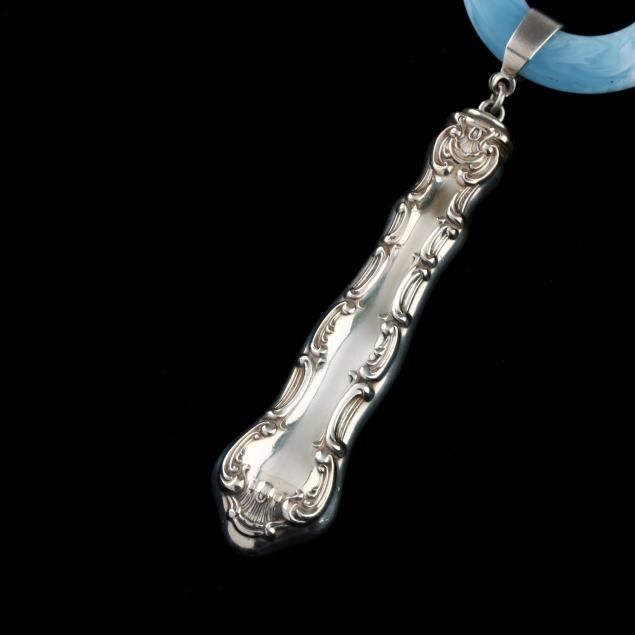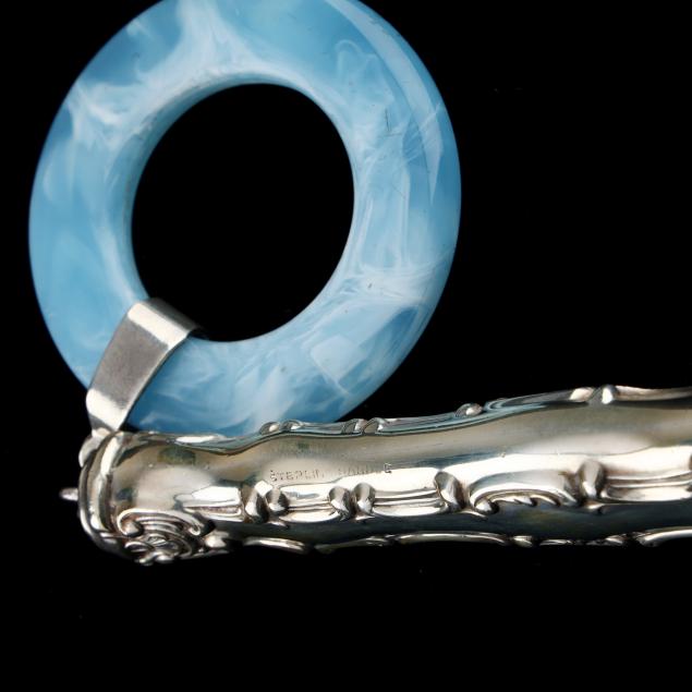 Featuring a rattling handle and marbled blue teething ring, not monogrammed.