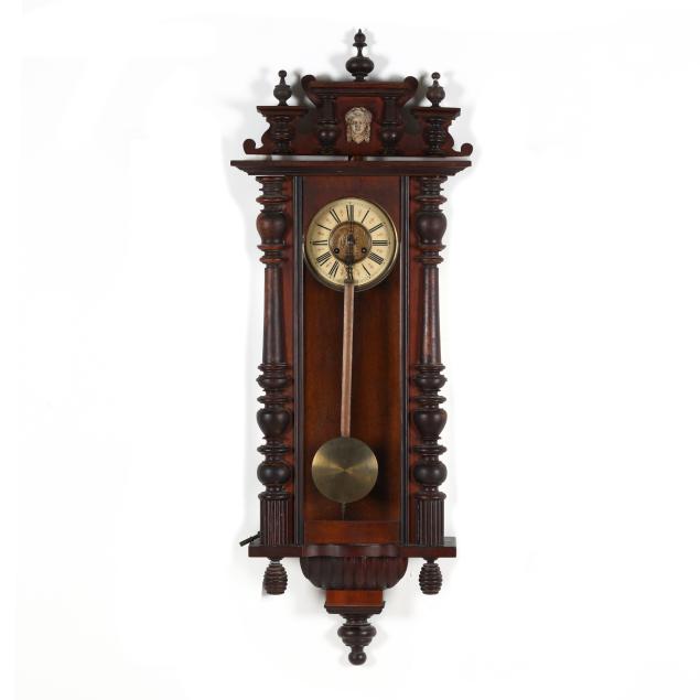 Likely Viennese or German, early 20th century, unmarked round enamel chapter ring with Roman markers and central brass repousse foliate motif, brass mounted dual train movement with gong striking on the half hour and hour, set within an architectural carved walnut and pine case with glass panels, together with pendulum and winding key.