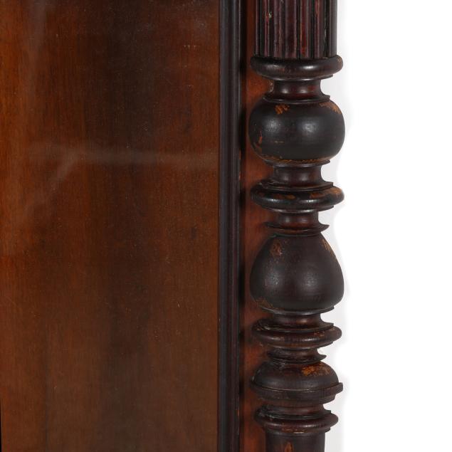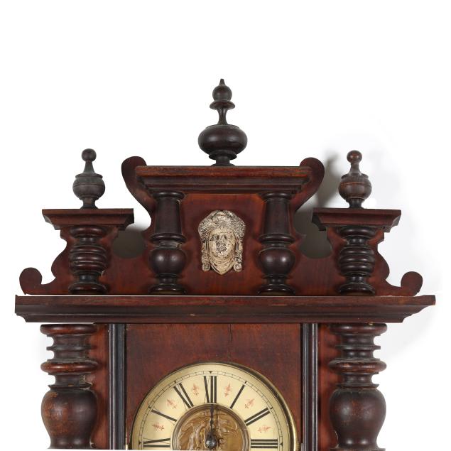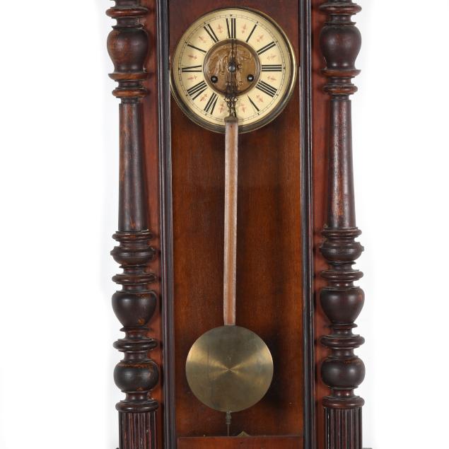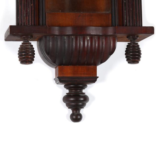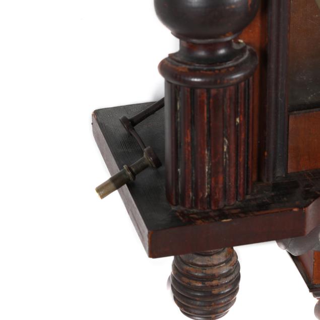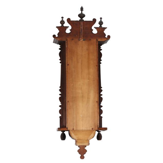From the Collection of Wade Woodleif, Henderson, North Carolina Some age toning to the enamel; some shrinkage and cracks to the veneers; some rubbing and minor edge nicks to the case; crack and repair to one pediment ear; denting to pendulum bob face. Please see Terms and Conditions of Sale: Clocks and Watches.