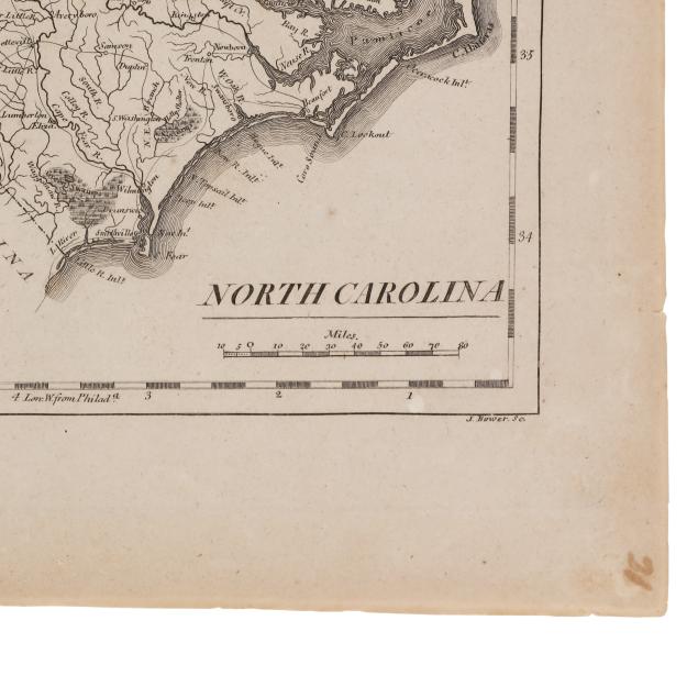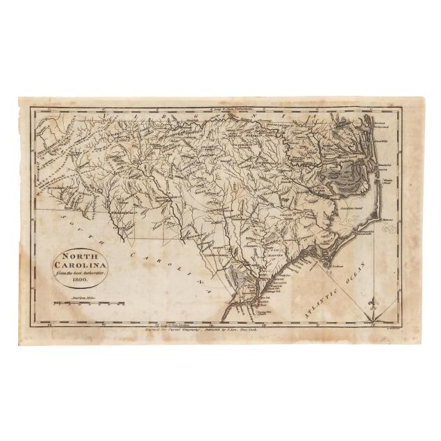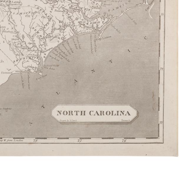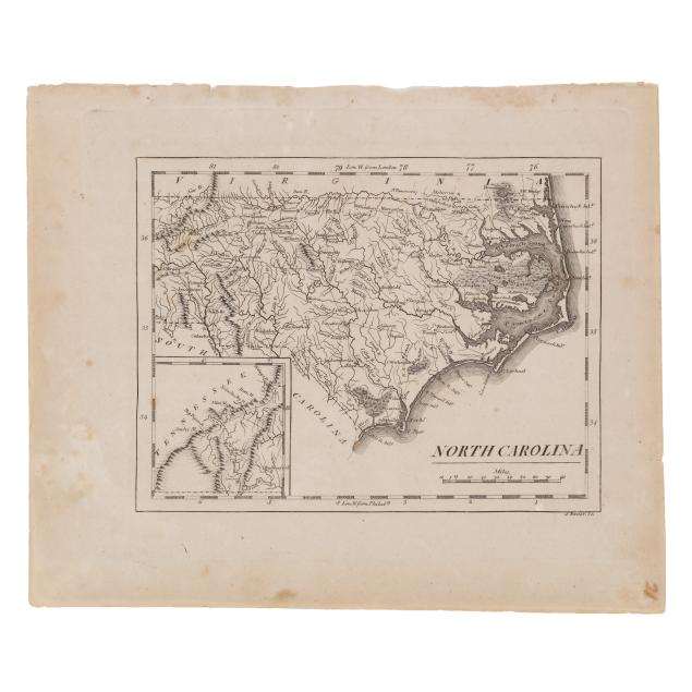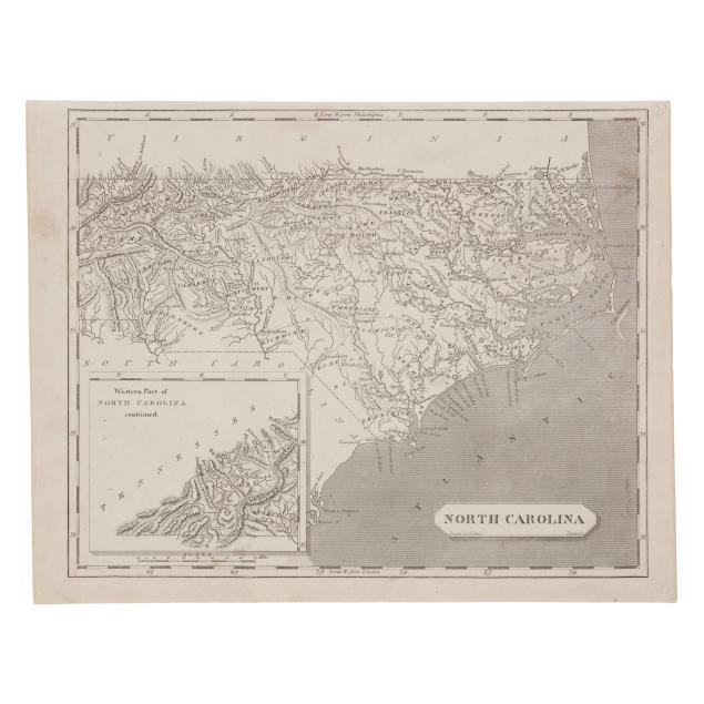 S[amuel] Lewis. NORTH CAROLINA. Boston, circa 1812. From Aaron Arrowsmith's and Samuel Lewis's A New and Elegant General Atlas. Drawn by Lewis and engraved by Tanner. With inset map of "Western Part of North Carolina continued," simple title cartouche, and labeled with towns, counties, rivers, swamps, and more, and a timely interest in the western part of the state; unframed. Sheet size 8 7/16 x 10 7/8 in. (Scattered foxing; slight age toning; margins with trimming and a closed tear; a lovely copy of this early map.)