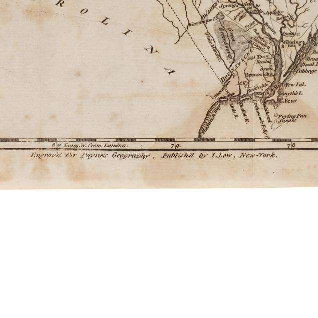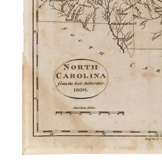John Payne. NORTH CAROLINA FROM THE BEST AUTHORITIES. 1800. New York: John Low, [1799]. Engraved by A. Anderson for volume IV of Payne's A New and Complete System of Universal Geography (volume dated 1799, map dated 1800). Detailed folding map with simple title cartouche; showing Grandfather Mountain, "Great Alligator dismal Swamp," and other important and interesting features labeled; unframed. Sheet size 8 3/8 x 13 5/8 in. (Age toning and foxing, with some areas of browning; fold lines, as issued, with a couple of additional creases and folds, minor edge wear including slight separation starting at fold, and two small stains at lower margin.)