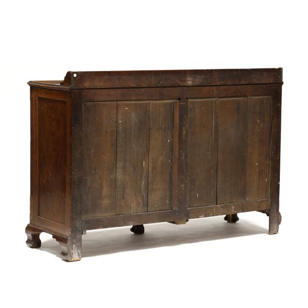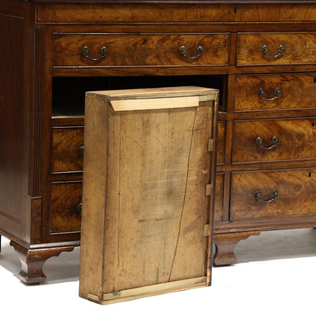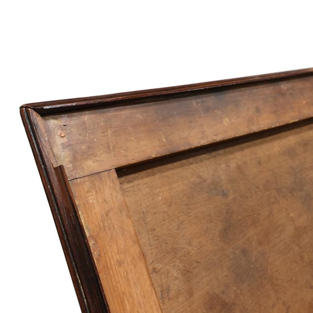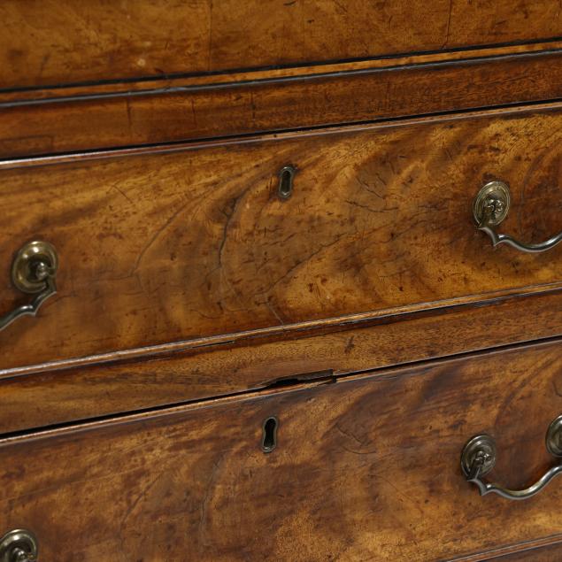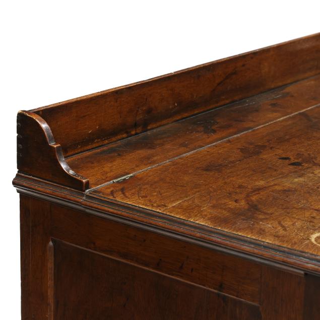 Private Collection, Landrum, South Carolina Top with old surface stains, scratches, shrinkage crack and finish wear; pulls are old and in the original holes; missing locks; front left foot with later glue block.