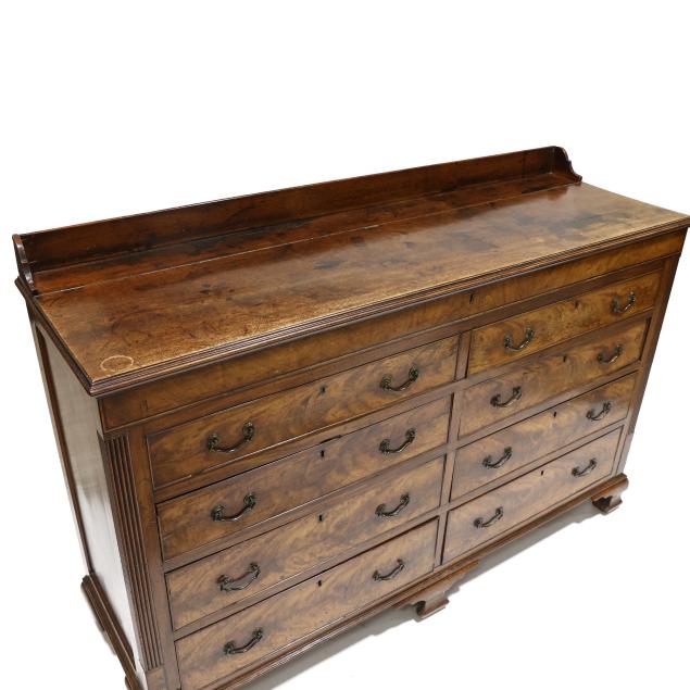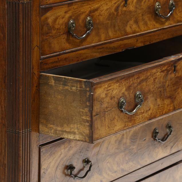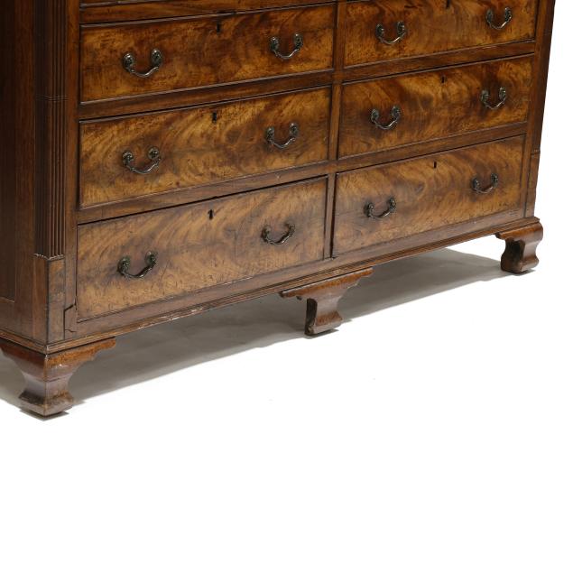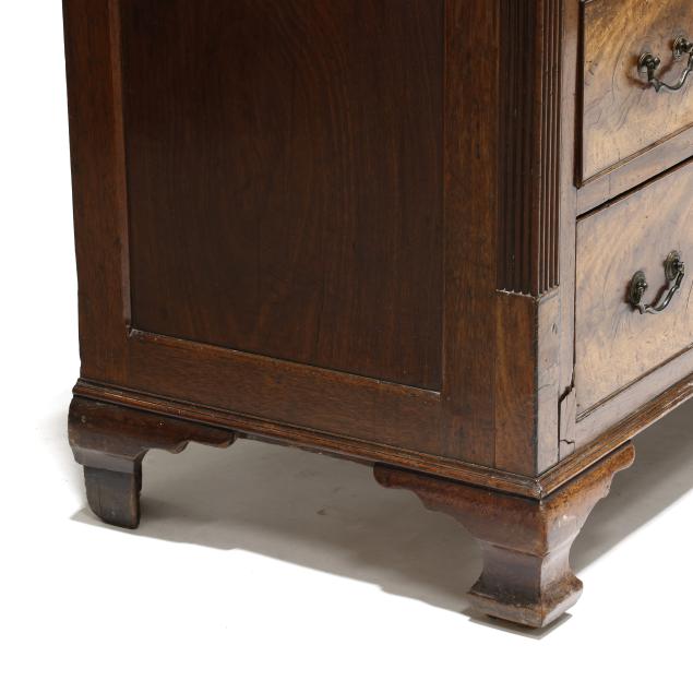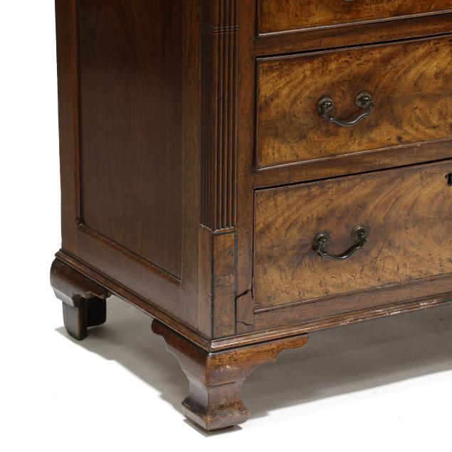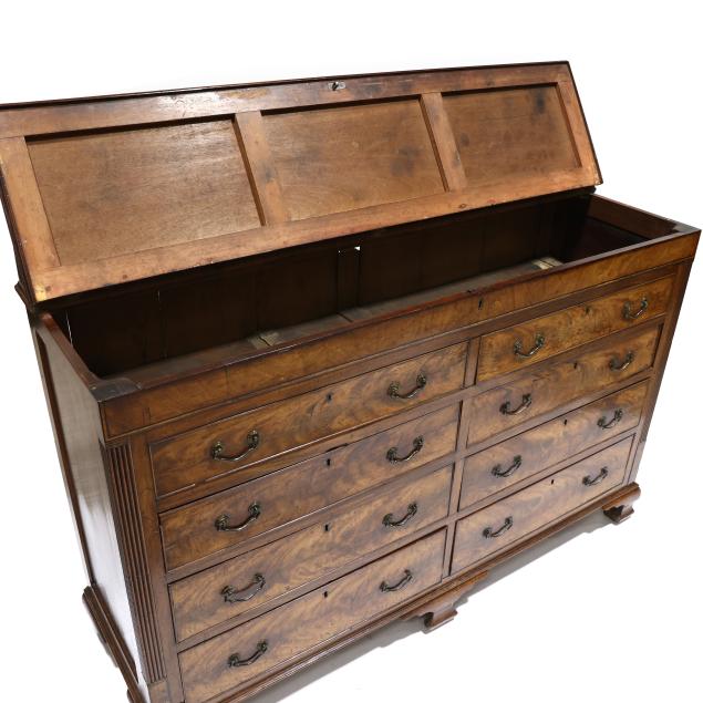 Circa 1800, mahogany veneer, oak and pine secondary, top with applied backsplash, hinged lid with molded edge, the case with banded inlaid frieze over four faux drawers over four functional cock beaded drawers, reeded stiles with inlaid banding, paneled sides, ogee bracket feet.
