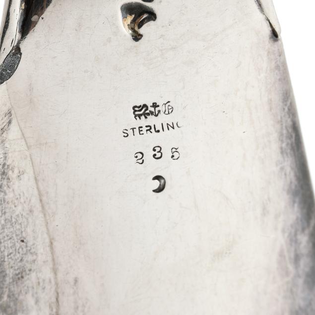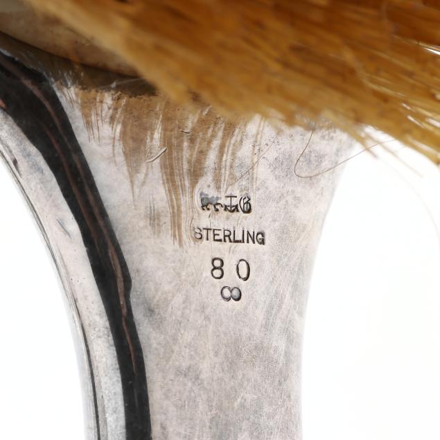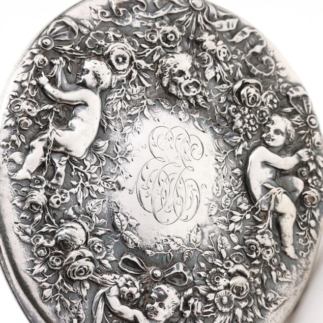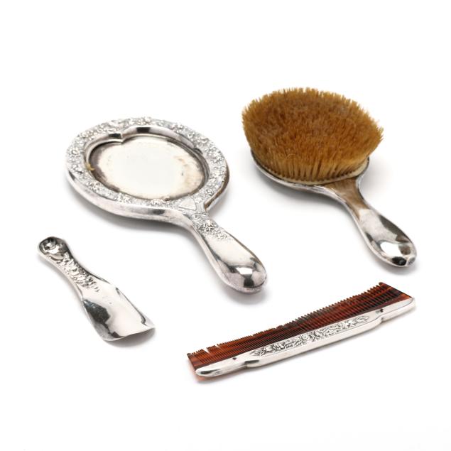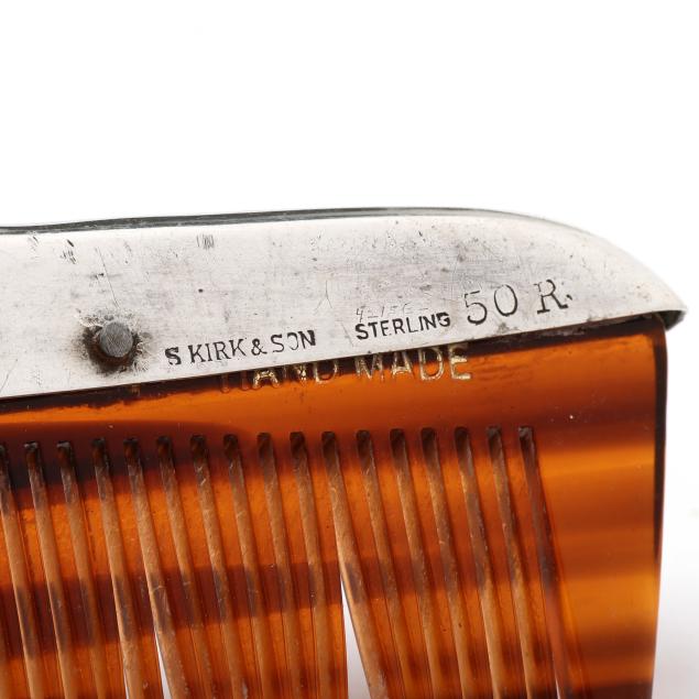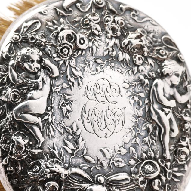 Pattern number 80, with repousse foliate, figural, and classical motifs, includes a hand mirror (10 1/2 in.); a hair brush (9 in.); and a shoe horn; this lot also includes and S. Kirk & Son repousse silver mounted comb; all but the comb monogrammed.