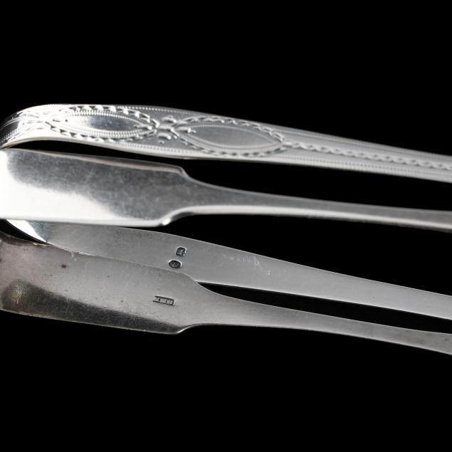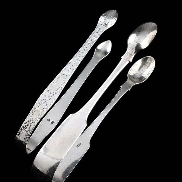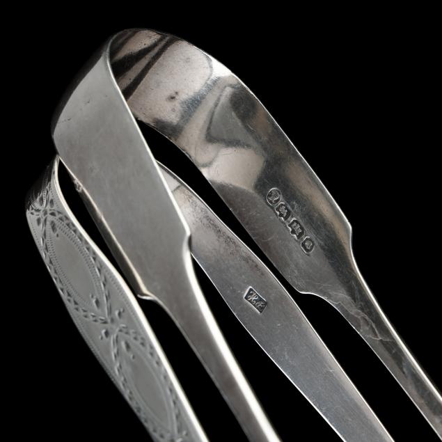 The first, a pair of George III silver tongs, mark of Hester Bateman, London (circa 1790), featuring acorn bowls and engraved decoration to the handles, monogrammed (5 3/8 in.); the second, a pair of Victorian silver tongs, mark of Henry M Norris, Exeter (1838), monogrammed (5 7/8 in.).