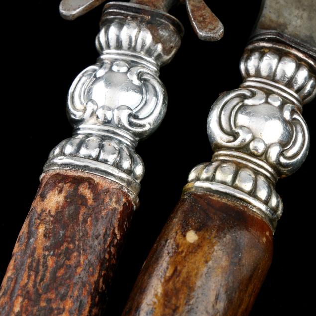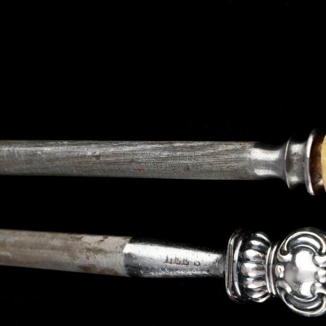 Incudes a set of (6) including (2) carving knifes, (2) carving forks, and (1) honing steel with uniform silver balusters, and (1) honing steel without silver mount, the large knife marked for Landers, Frary & Clark, Connecticut.