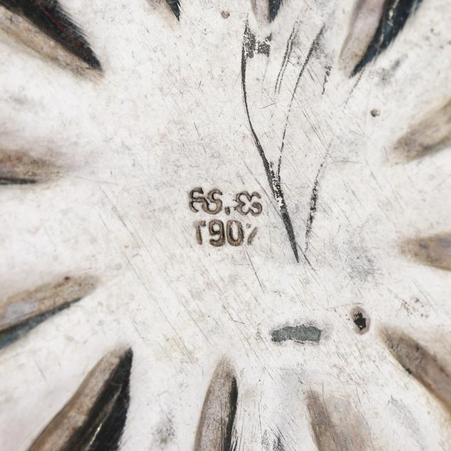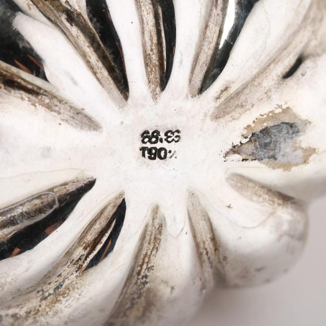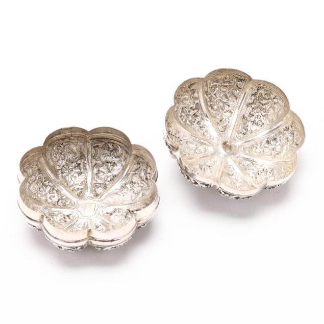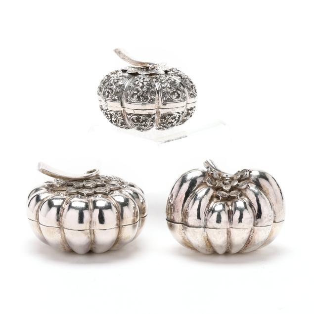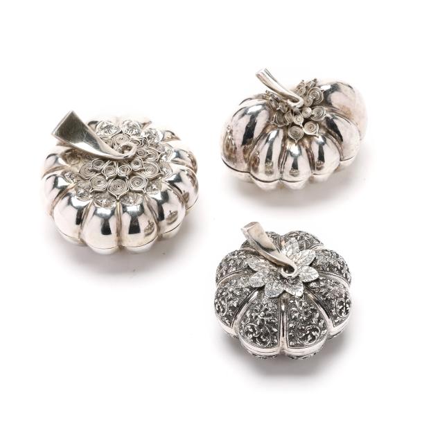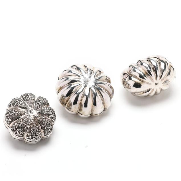 20th century, all with "T.90" and "88.88" marks to the undersides, all in the form of pumpkins, (2) with filigree decoration tot he tops; one with allover repousse; not monogrammed.