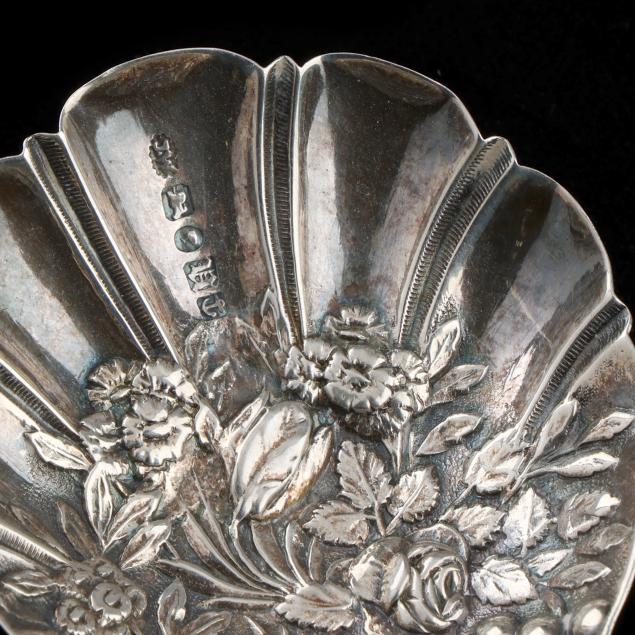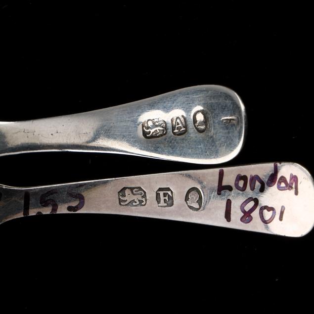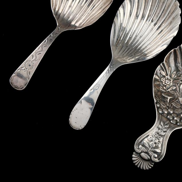 The first, a George III silver spoon, London (1796), rubbed maker's mark, with a shell bowl and engraved handle; the second, a George III silver spoon, London (1801), with a shell bowl and engraved handle, no maker's mark found; the third, a Victorian silver spoon, mark of Joseph Willmore, Birmingham (1843) with a shell bowl and repousse decoration; none monogrammed.