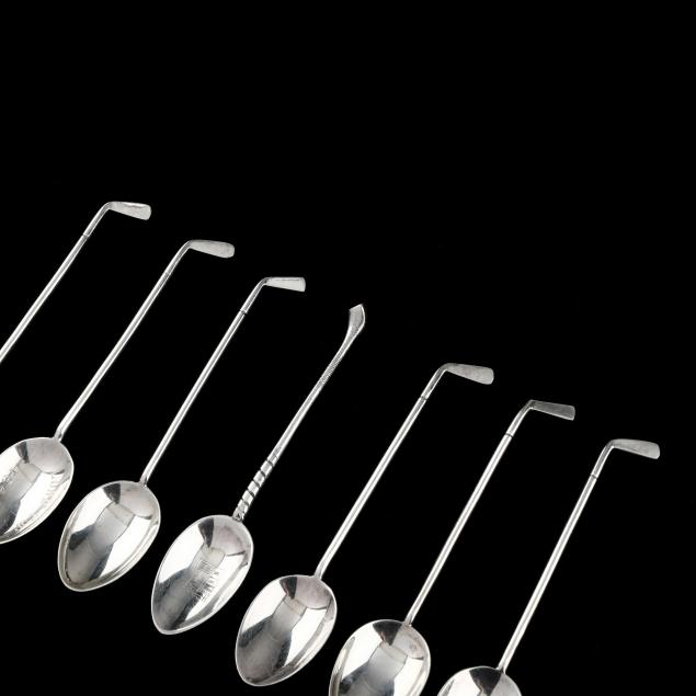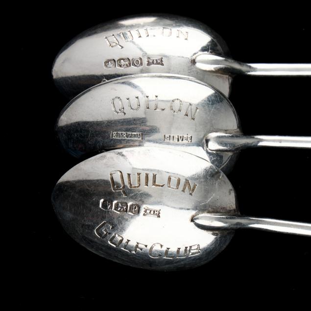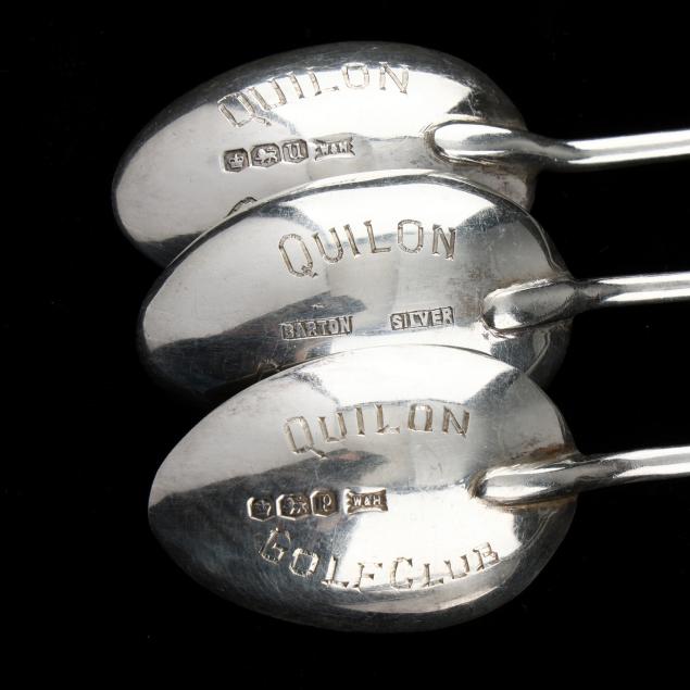 Includes a set of (4) with marks of Walker & Hall, Sheffield (1931), (1932), (1937); (1) with mark of Richards & Knight, London (1979); and (2) marked "Barton Silver"; all engraved to the verso bowl "Quilon Golf Club", one with architectural engraved bowl, and one engraved "Lord Cup /1941".