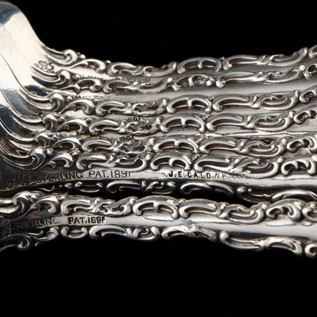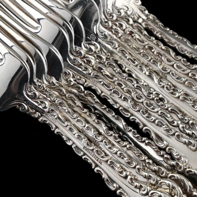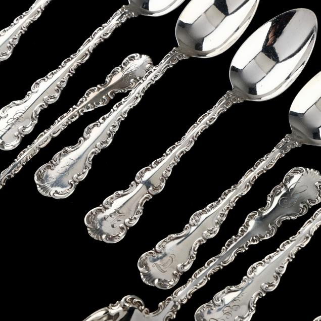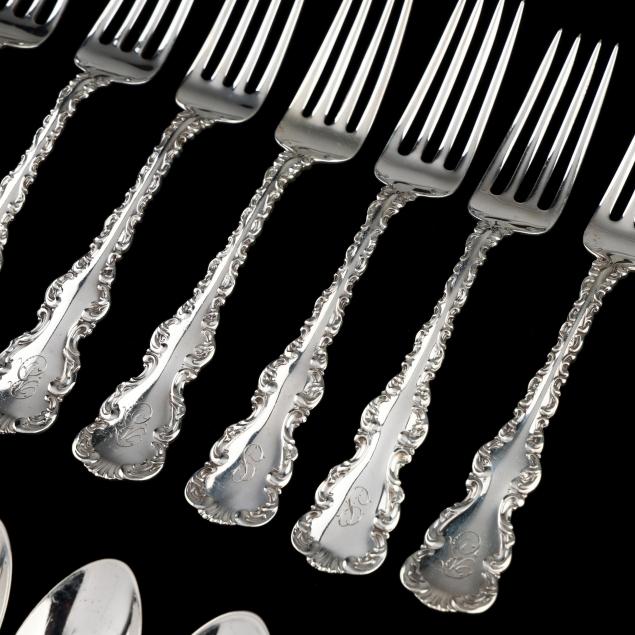 (32) pieces to include (13) forks (6 3/4 in.); (17) teaspoons (5 3/4 in.); a cream ladle; and a sugar spoon; various monograms.