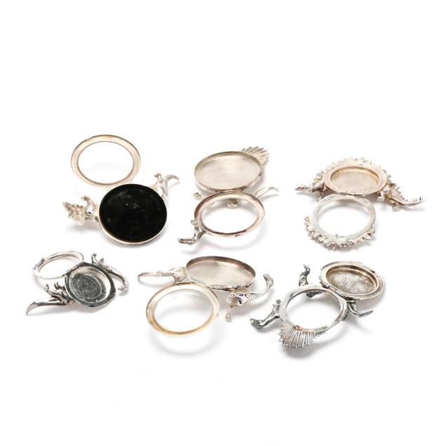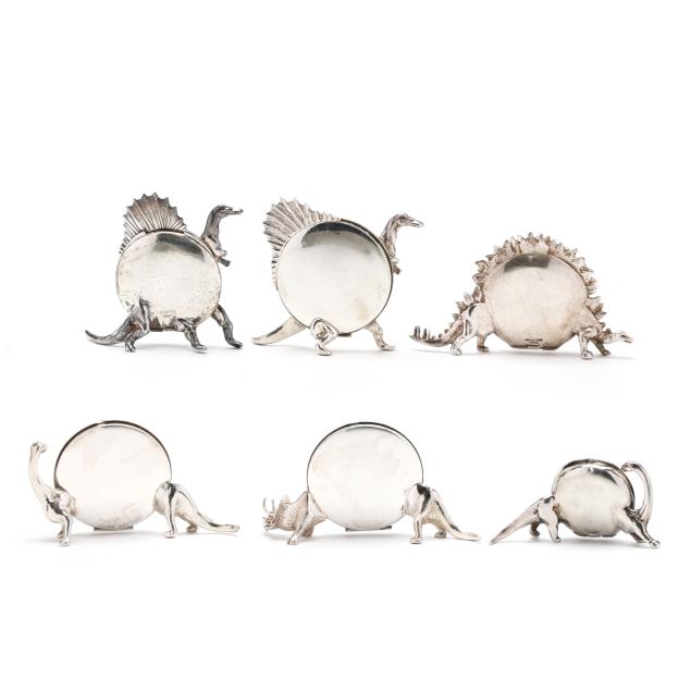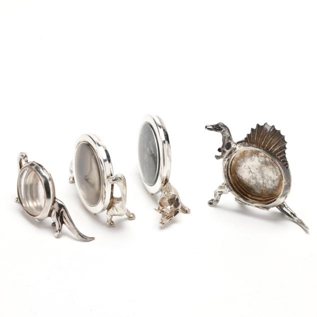 (3) marked "Homlitas"; and (3) with unidentified maker's marks; various dinosaur forms circular frames at the center; all retaining glass.