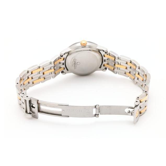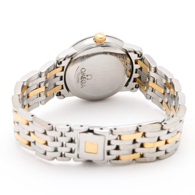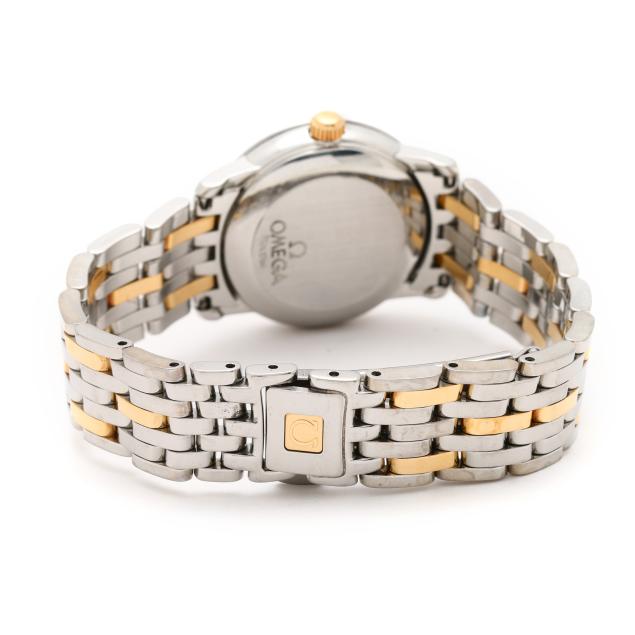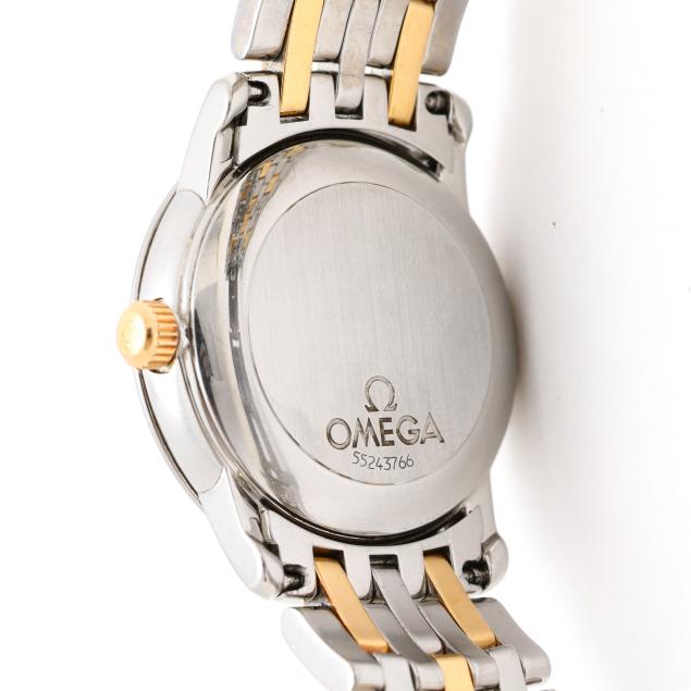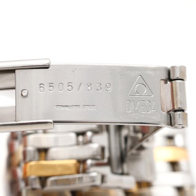 Circa 2000, automatic, Omega 725 / ETA 2000, serial number 55243766, reference number 4390.11.00, caseback number 566 1050, the round stainless steel case with polished gold bezel, the signed gold-tone dial with gold baton hour markers, gold dagger hands, and date window at 3:00 hour, the stainless steel and gold-capped bracelet with signed deployant clasp numbered 6505/839, the caseback signed and numbered 55243766.