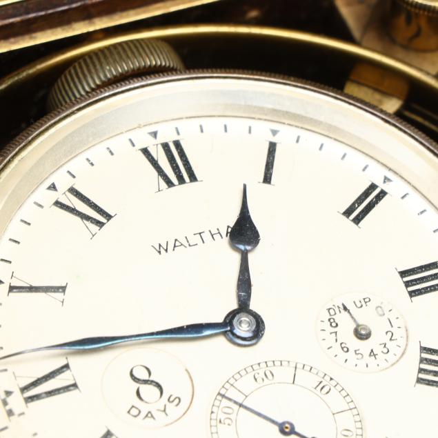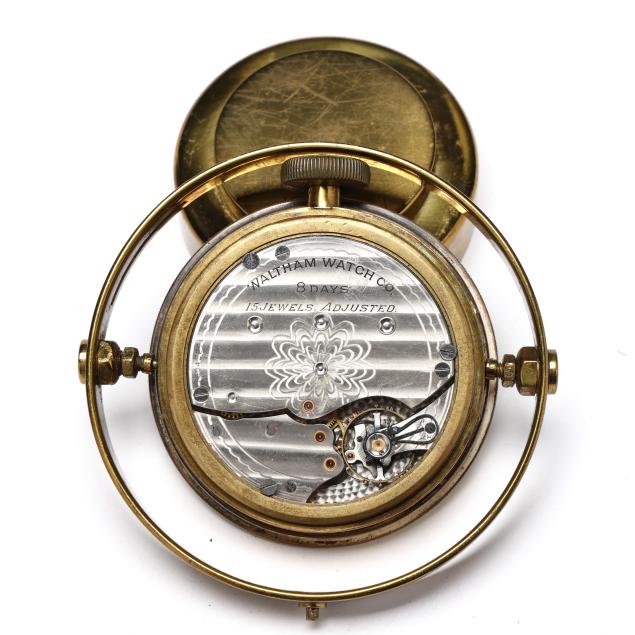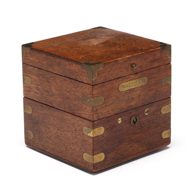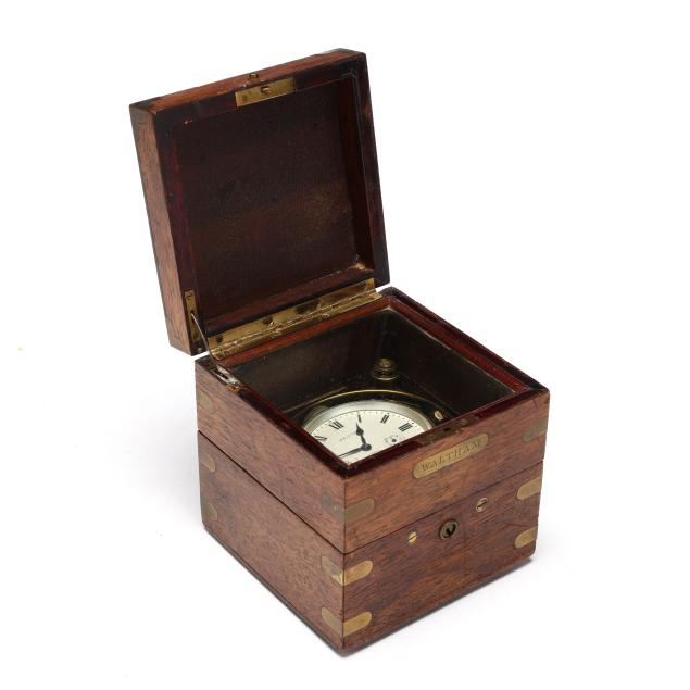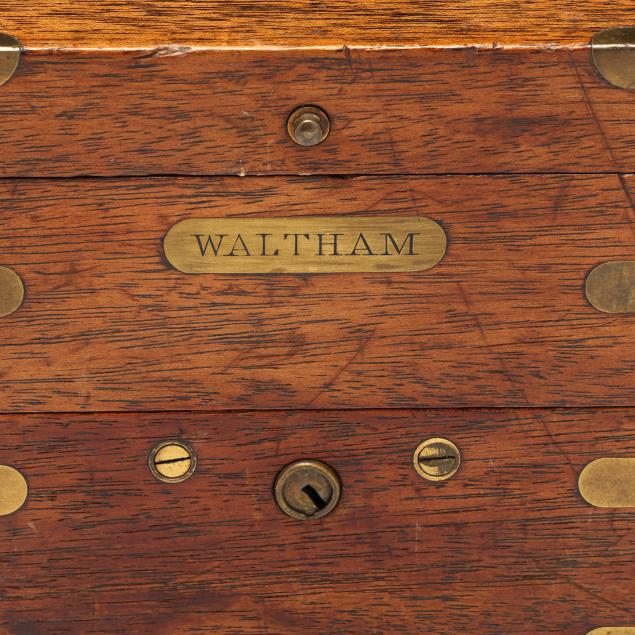 Waltham, Massachusetts, first quarter 20th century, mahogany and brass mounted hinged case, opens to a gimbaled brass ship's chronometer behind glass, with 2 3/4 in. dial operated by a 15 jewel movement, signed to dial, movement and case exterior, includes case key.