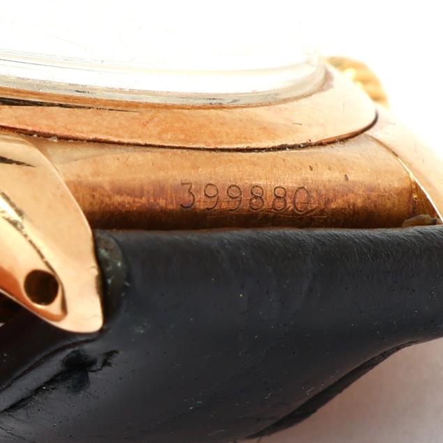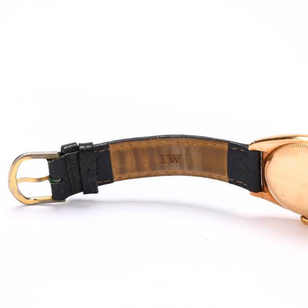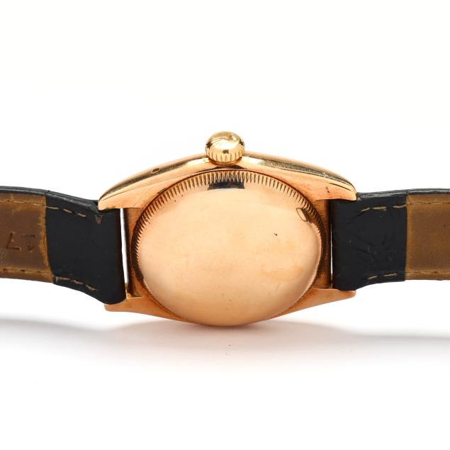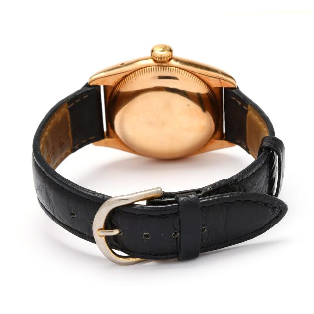 Circa 1946, automatic, reference number 3130, case number 399880, movement number N17022, the gold three-piece Oyster case with polished gold bezel and Swiss hallmark for 14KT, the signed silver dial with luminescent Arabic numeral hour markers and blued steel luminescent alpha hands, the black leather strap completed with gold-tone buckle, the signed caseback interior stamped 0,585-14K.