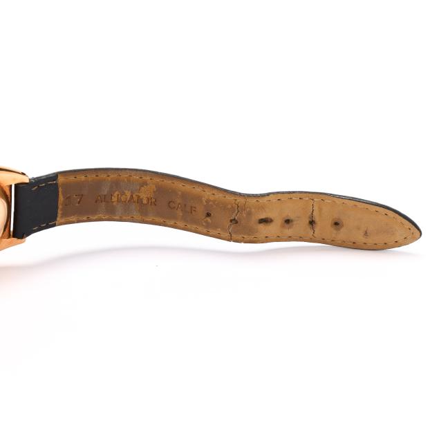 Scratches to case, bezel, and crystal; patina to dial; loss of luminescence to hour markers and partial loss to hands; wear to leather strap; running at time of examination. Please see Terms and Conditions of Sale: Clocks and Watches.