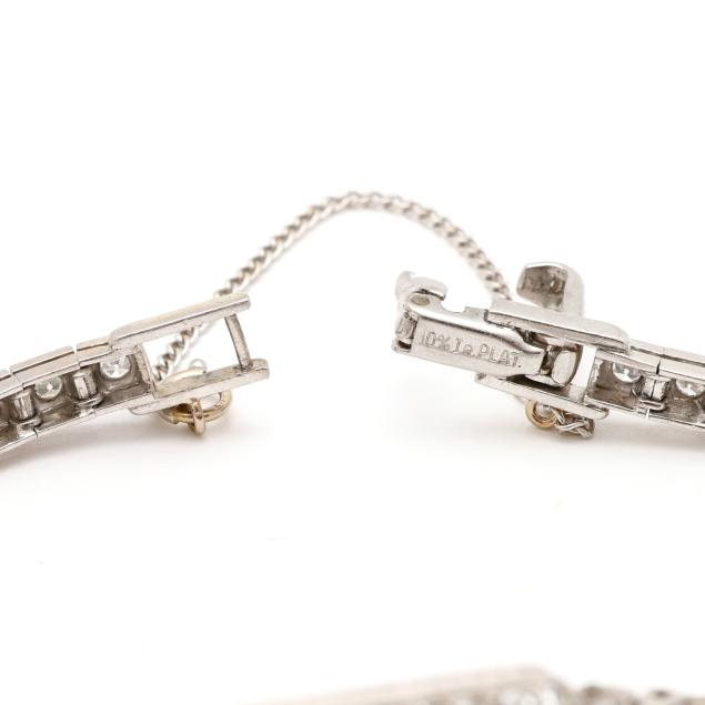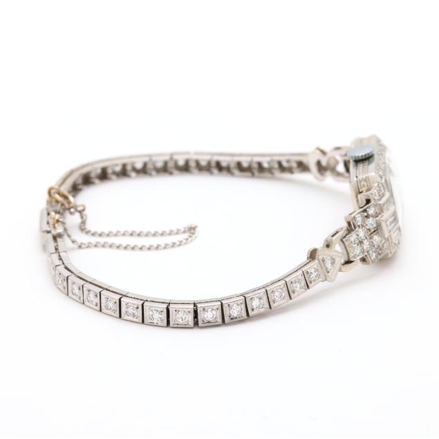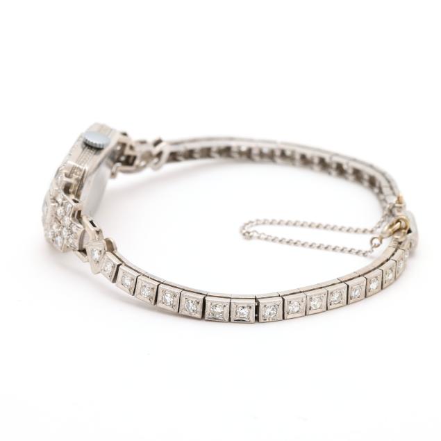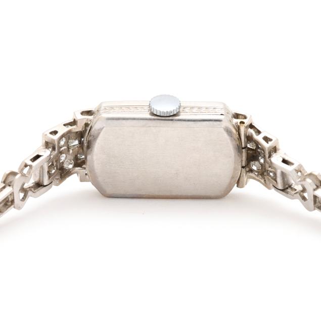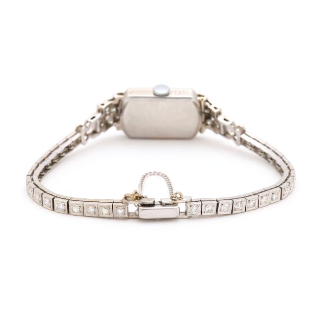 Manual wind, case number 7001, the rectangular platinum case with single cut round and baguette cut diamond surround, the silver tone dial with black Arabic numeral hour markers and blued steel spade hands, the platinum line bracelet set with single cut round diamonds, completed with fold over clasp stamped 10%Ir.Plat, with safety chain, the case back inside marked Iridium / Platinum / 7001. The total diamond weight is approximately 1.90 carats (H-I color, VS2-SI1 clarity).