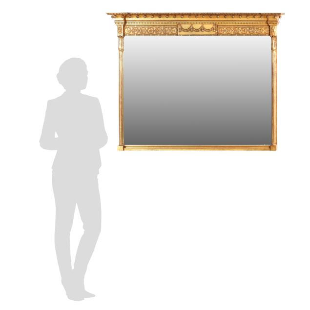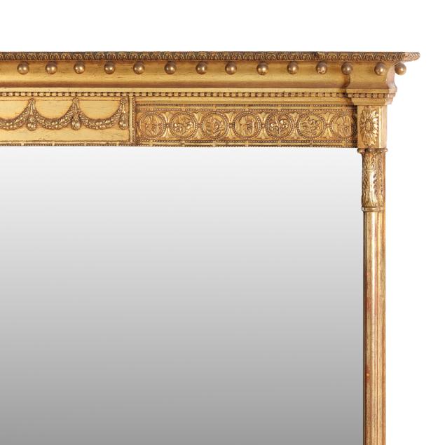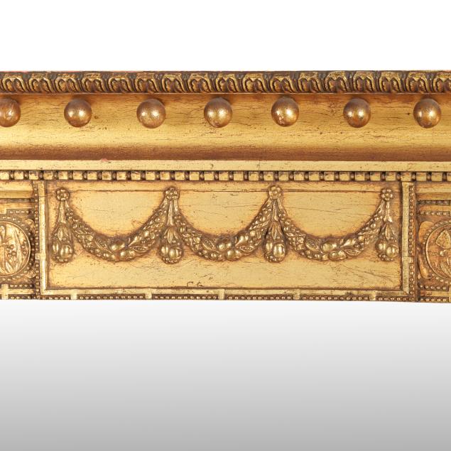 Scattered small cracks to floral medallions and columns; small chips to cornice corners; small areas of gilt rubbing to spherical mounts; a few small frame chips to verso; later mirror and backing.