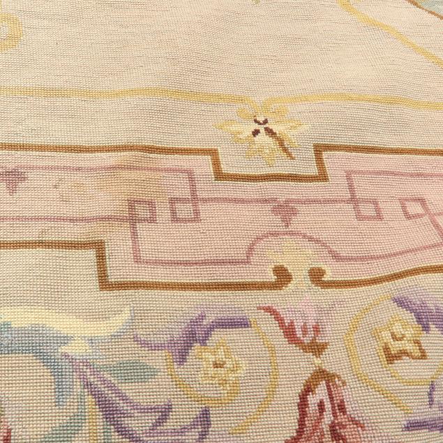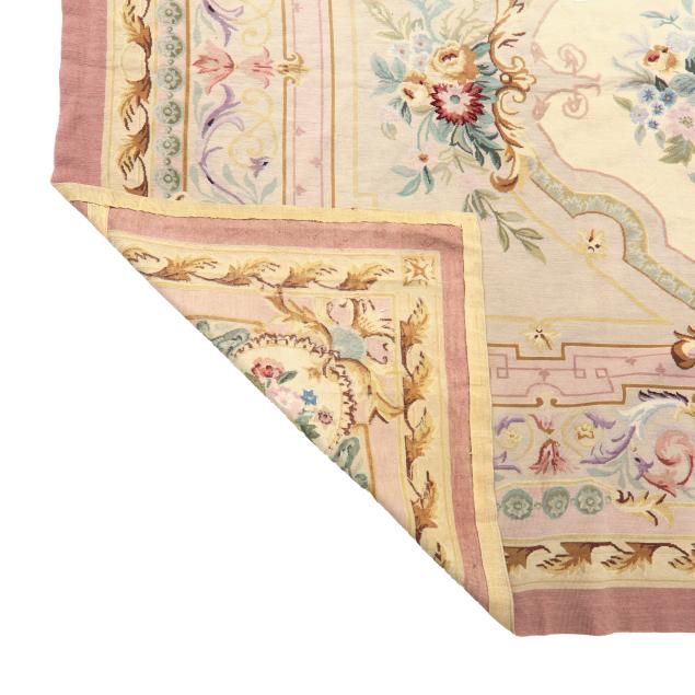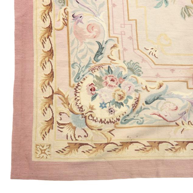 Wool on cotton foundation, the central cream field with floral clusters and pink and gold architectural borders, with floral cartouches to each corner.