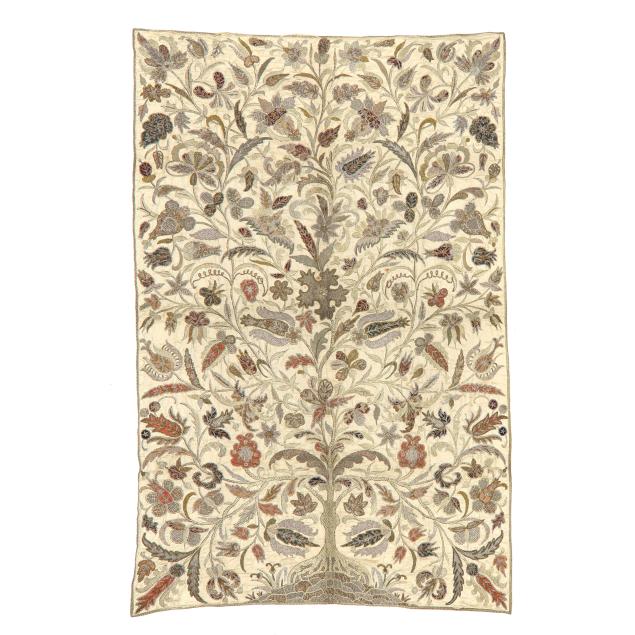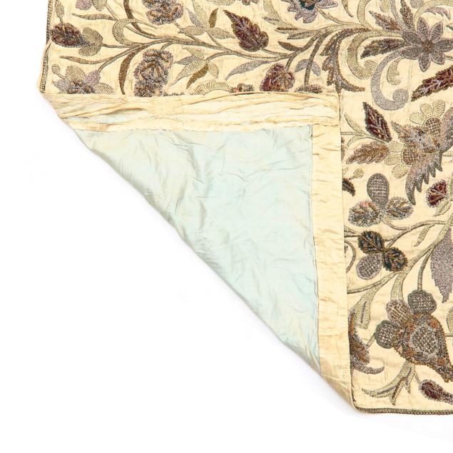 18th or early 19th century, metallic thread and appliqued brocade silk on silk ground, comprising a tree of life design worked in various shades and textures of metallic thread and purl, with leaves and floral elements made of various colored and patterned brocade silks appliqued to cream silk ground, the edges finished in gold thread, and lined to back with pale blue silk.
