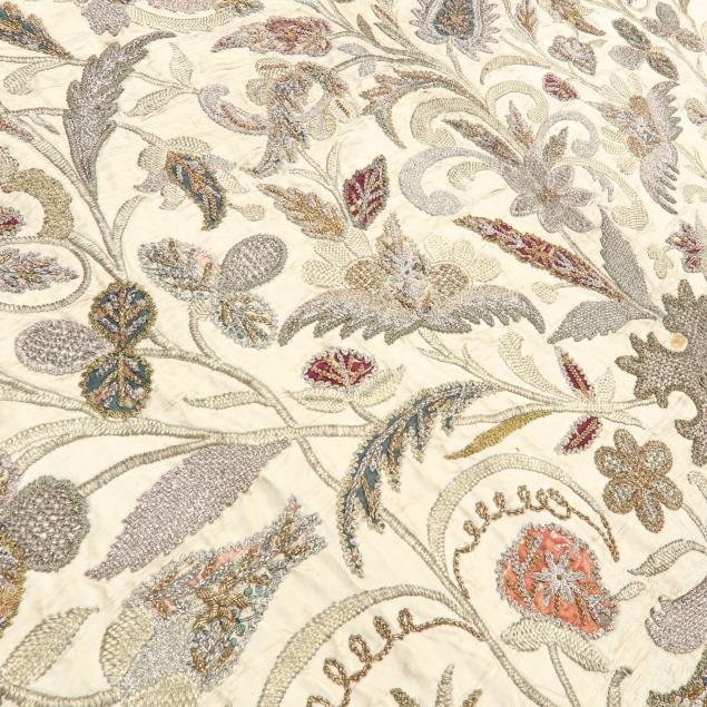 Extensive shattering and fraying to silk; staining and discoloration; areas of old repair; otherwise the embroidery and goldwork is in excellent condition, and the fabrics have minimal fading.