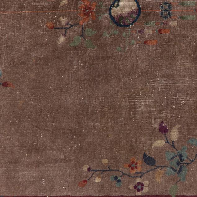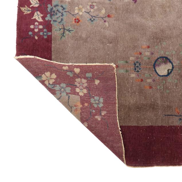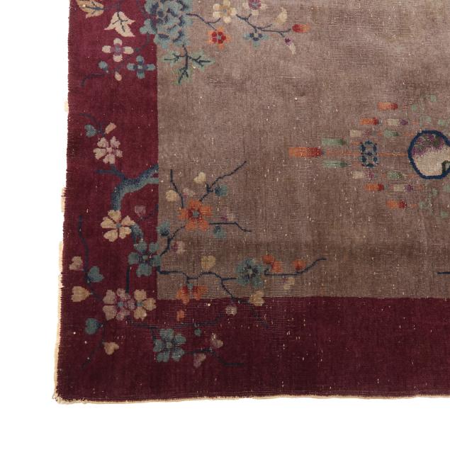 Early 20th century, wool, the mushroom colored field with purple border, with stylized floral sprays.