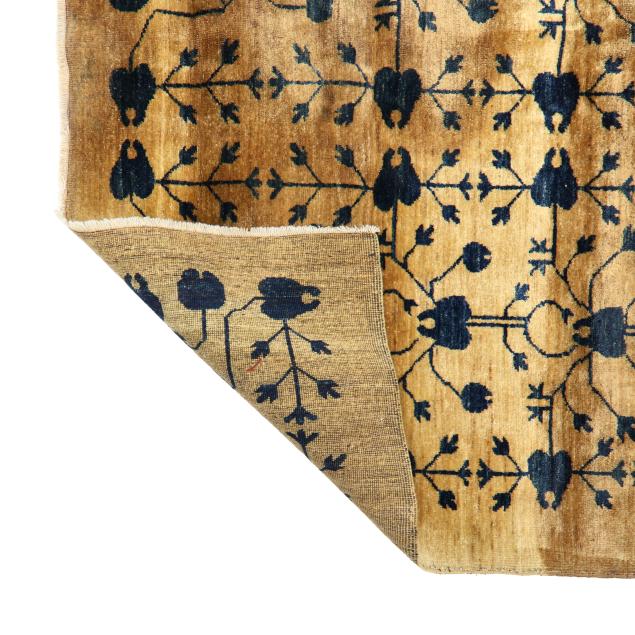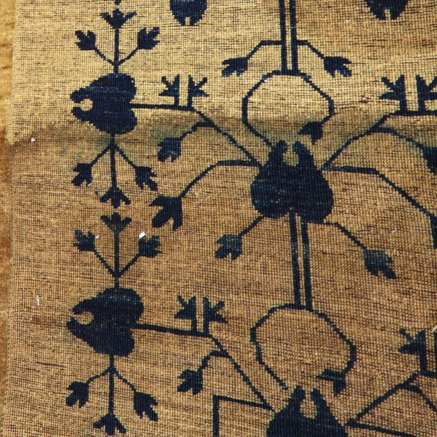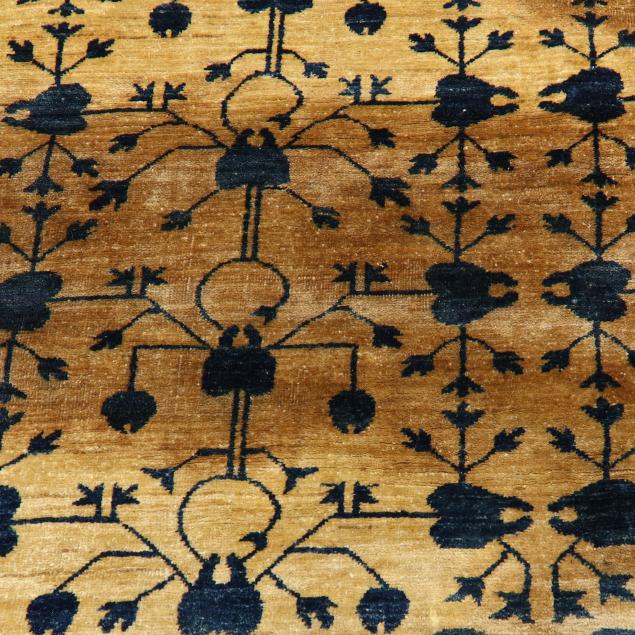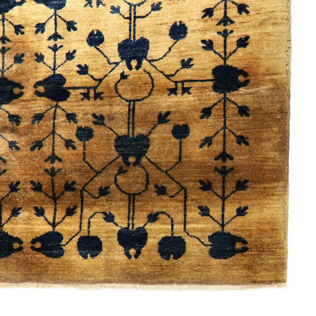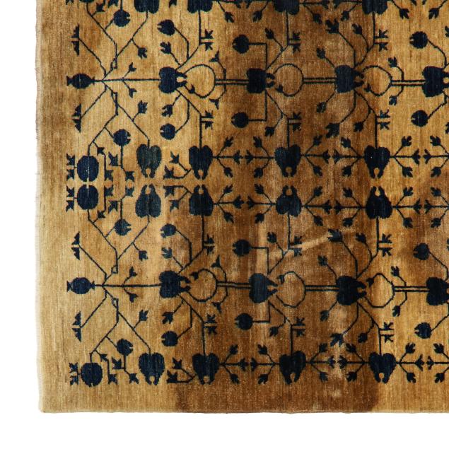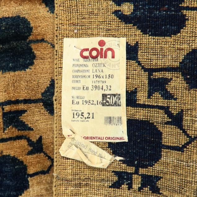 Wool on cotton foundation; the tan field with stylized floral lattice pattern in navy blue, label to verso indicated made in Uzbekistan.