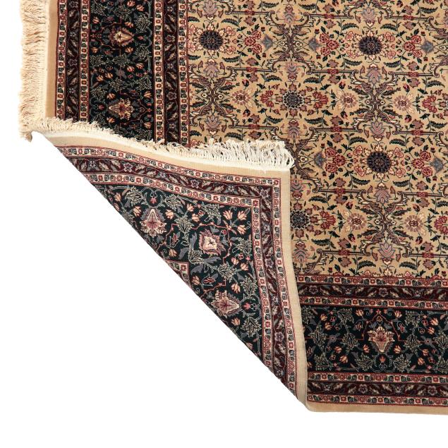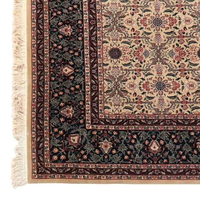 Wool on cotton foundation, finely knotted, the taupe center field with repeating floral and foliate lattice motifs, the main black border with repeating floral and foliate motifs, within multiple minor florette borders.