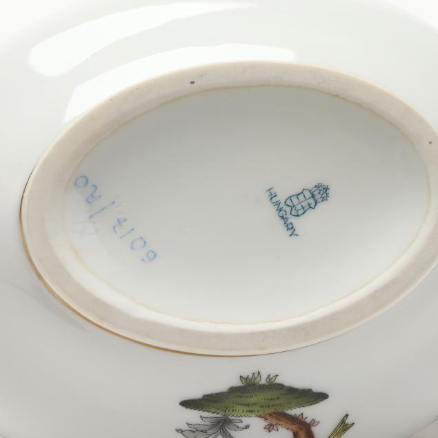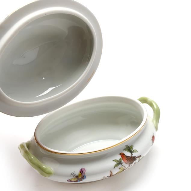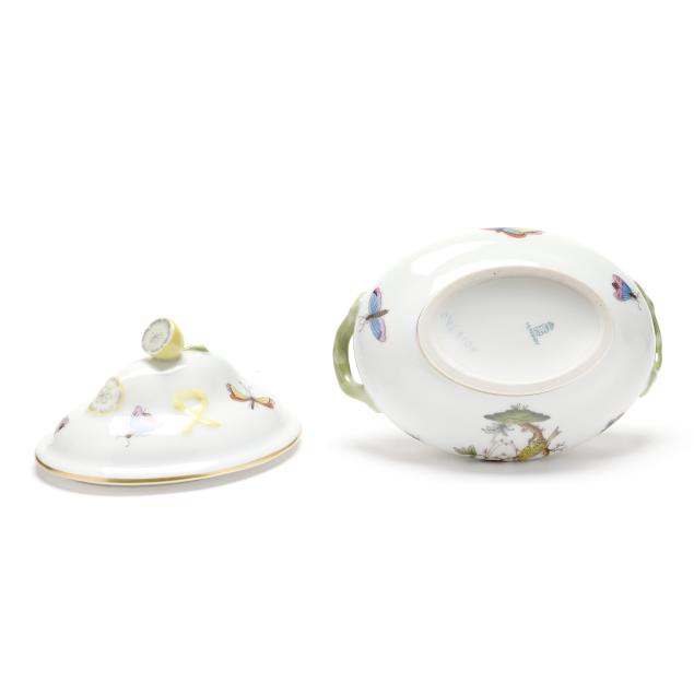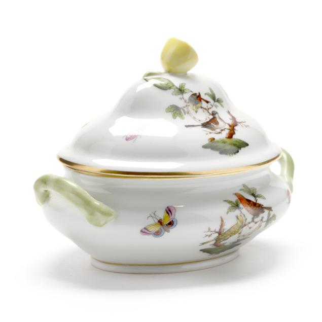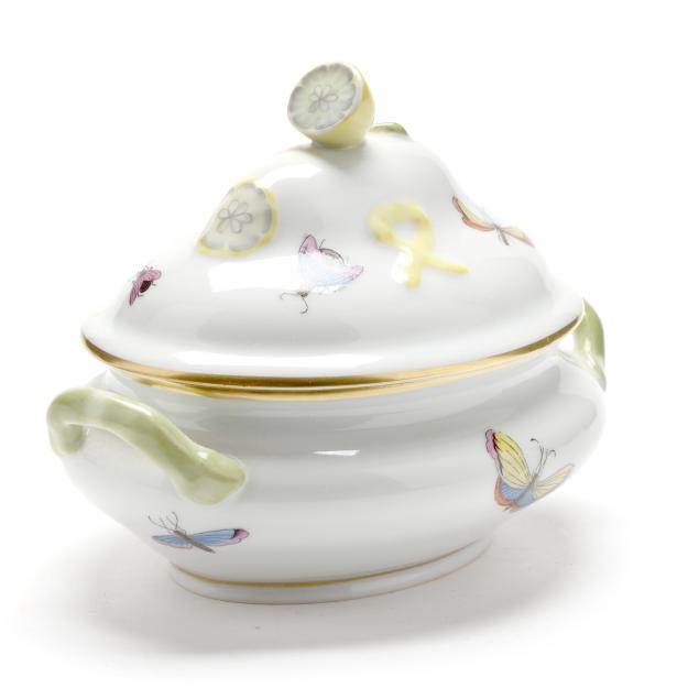 Hungary, hand-painted and gilt porcelain, #6017 mini tureen with lemon finial and yellow ribbon motif to lid, marked with company backstamp to underside.