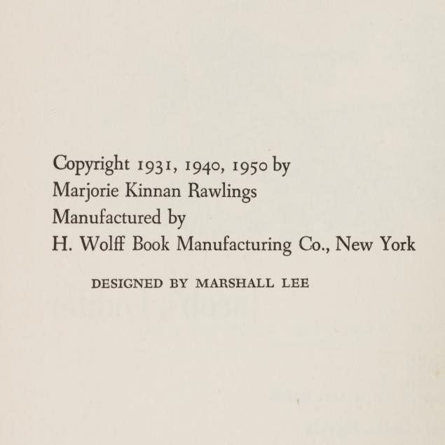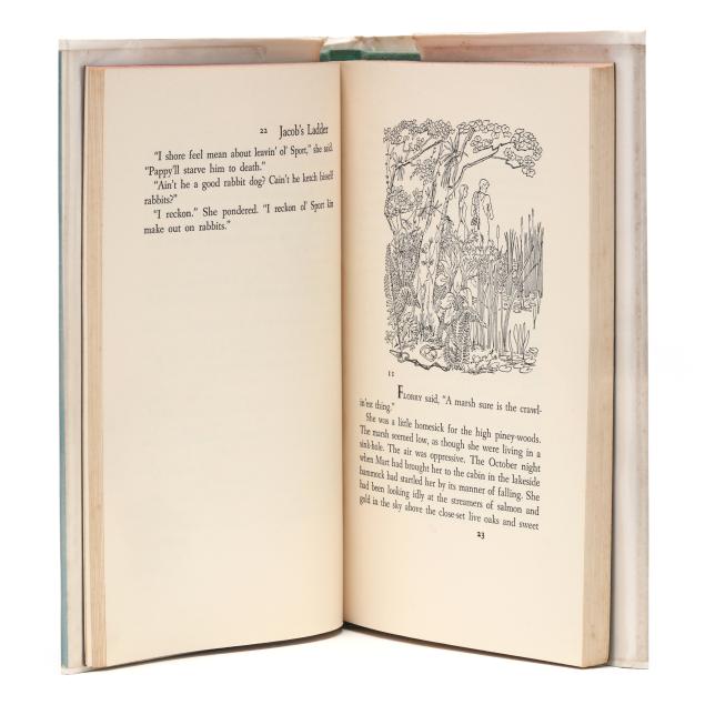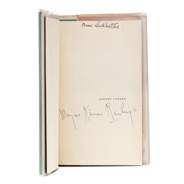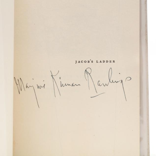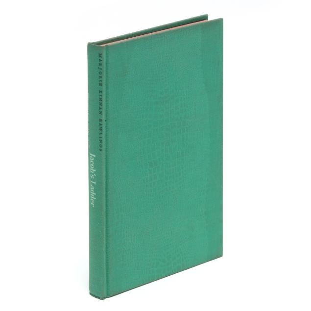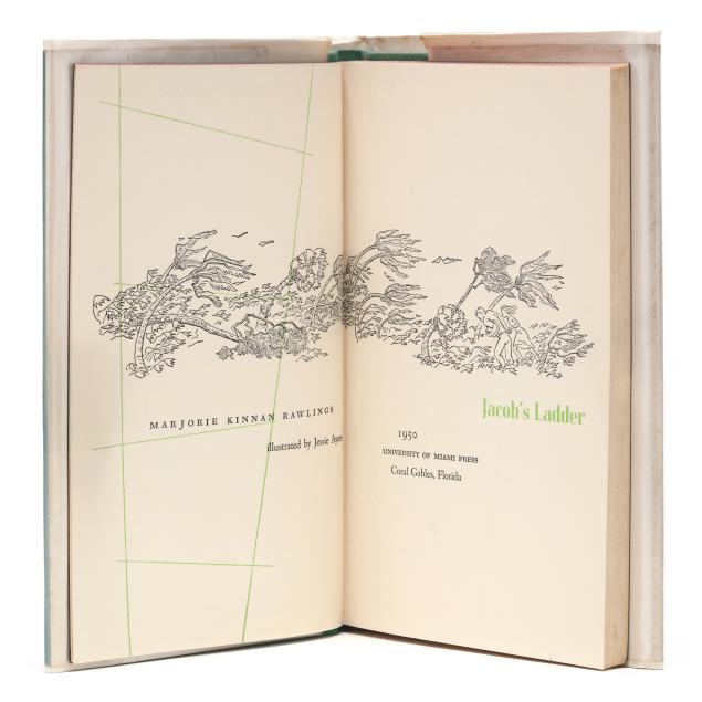 Marjorie Kinnan Rawlings; Jessie Ayers, illus. JACOB'S LADDER. Coral Gables: Florida: University of Miami Press, 1950. First edition. Signed by the author on the half-title. Green cloth-covered boards blind-stamped to resemble alligator skin, spine lettered in white and black, top edge stained; in unclipped ($2.75) illustrated dust jacket. 8vo; 118pp.
