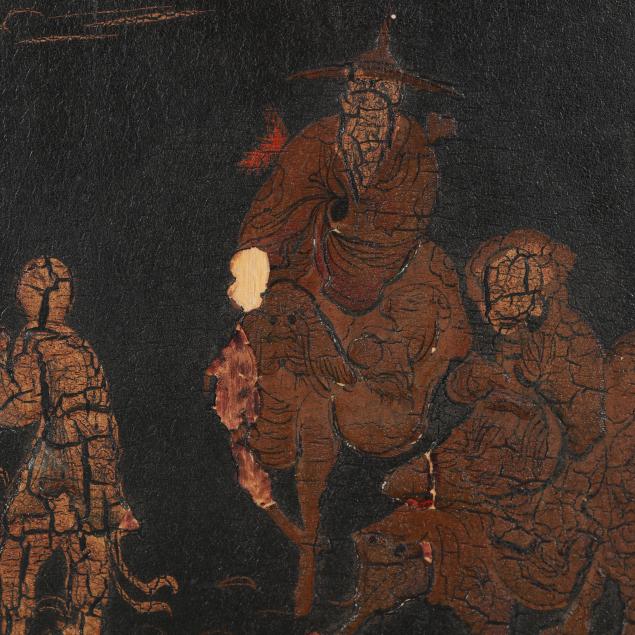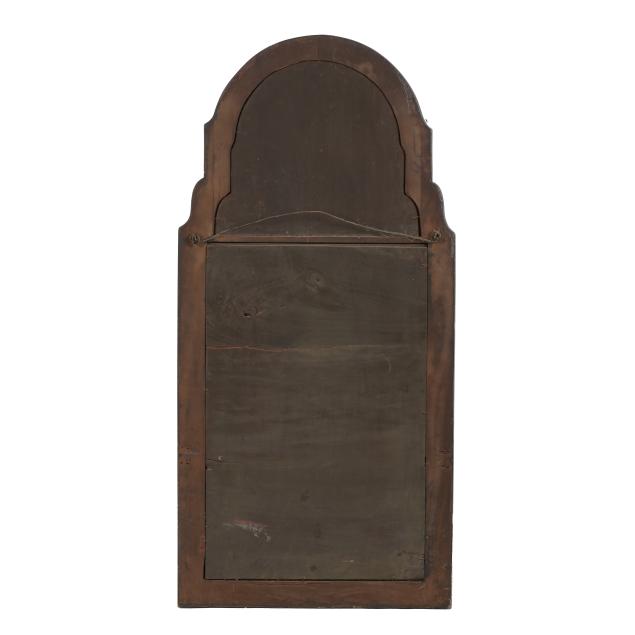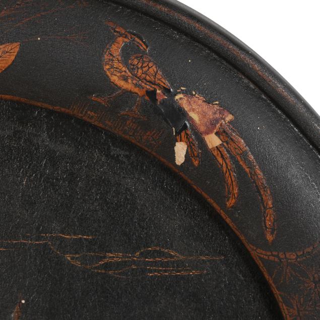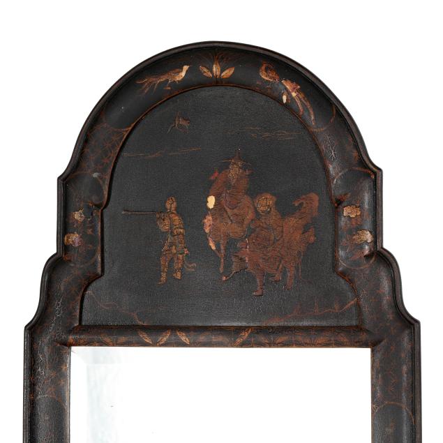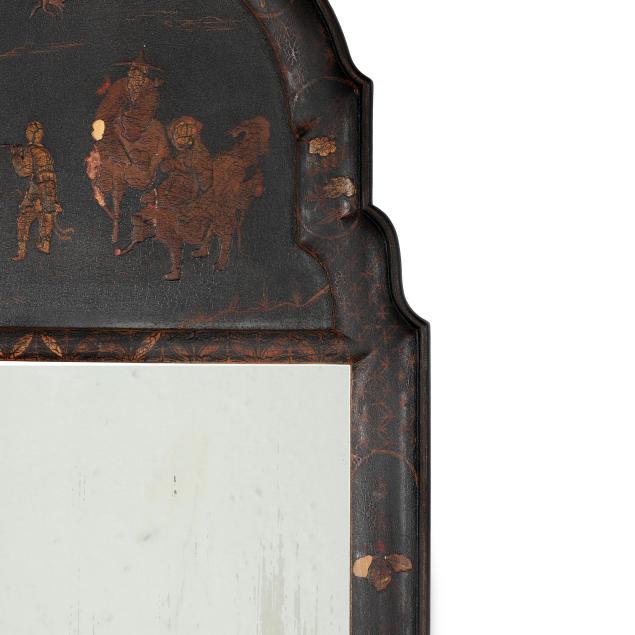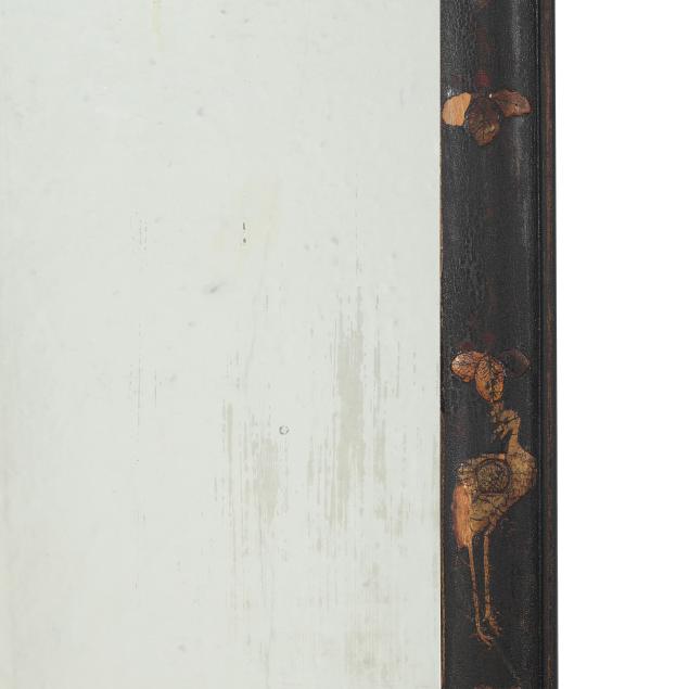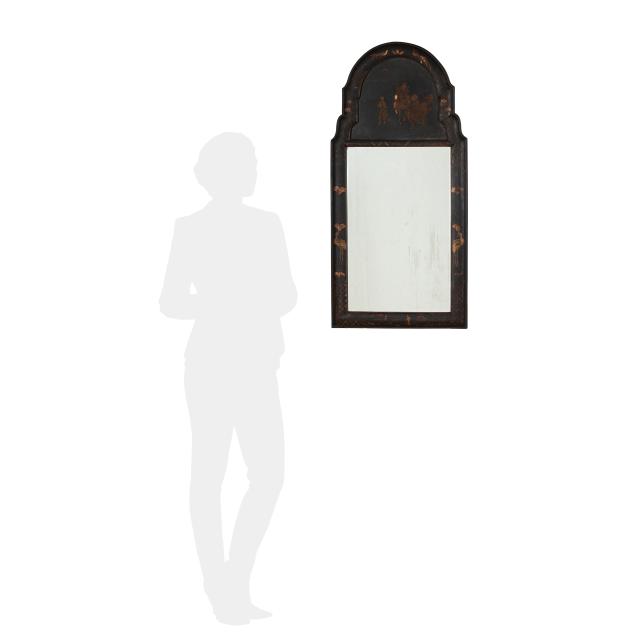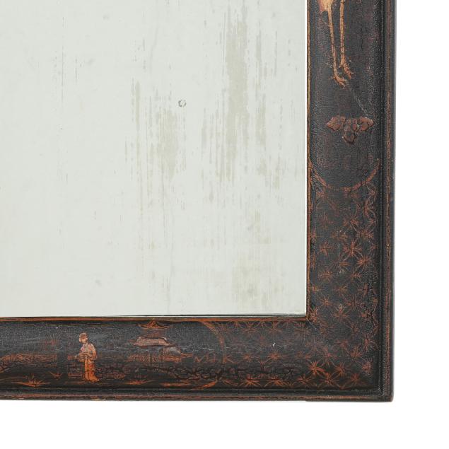 Early 20th century, allover black paint with raised and gilt decoration, shaped upper panel pediment over a beveled rectangular mirror.
