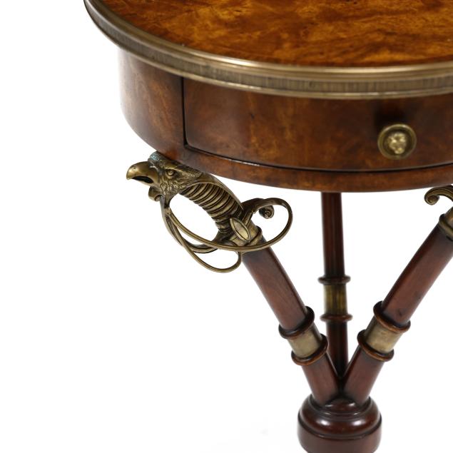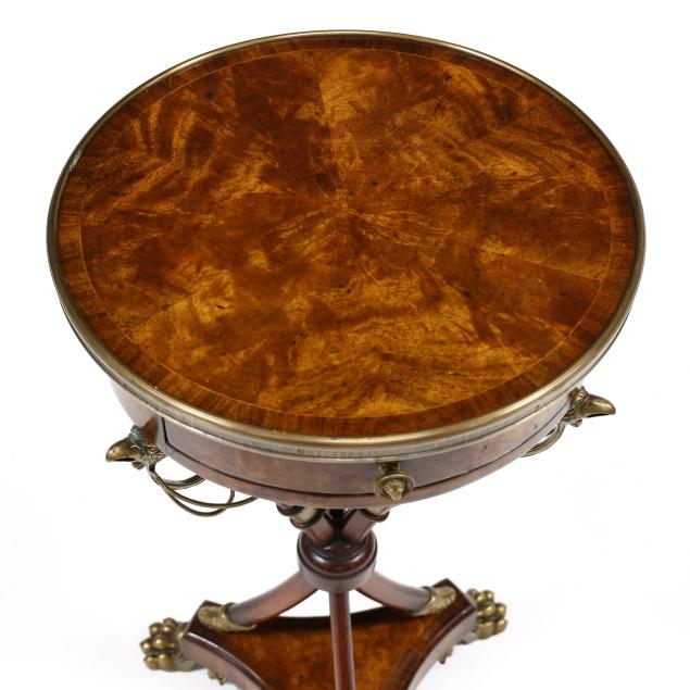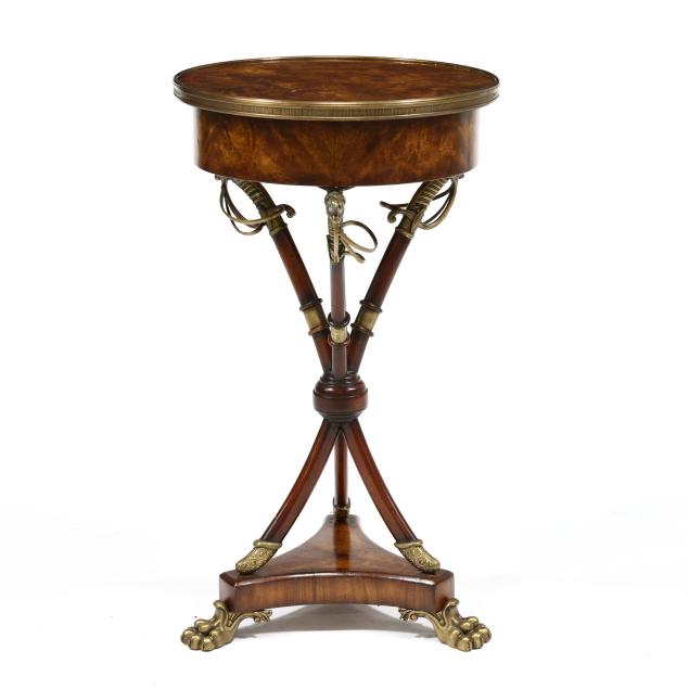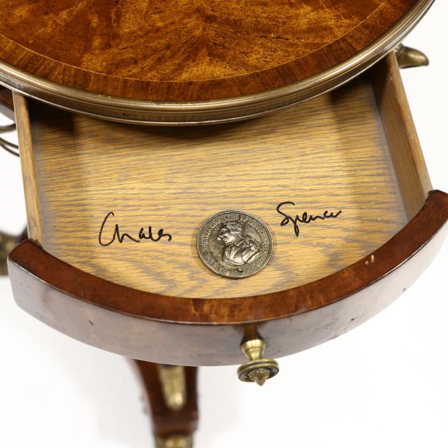Contemporary, Althorp Living History collection, mahogany veneers, bronze mounts, circular top with single drawer supported by three faux swords on tripod base with paw feet, interior of drawer is labeled and ink signed by Charles Spencer, 9th Earl Spencer.