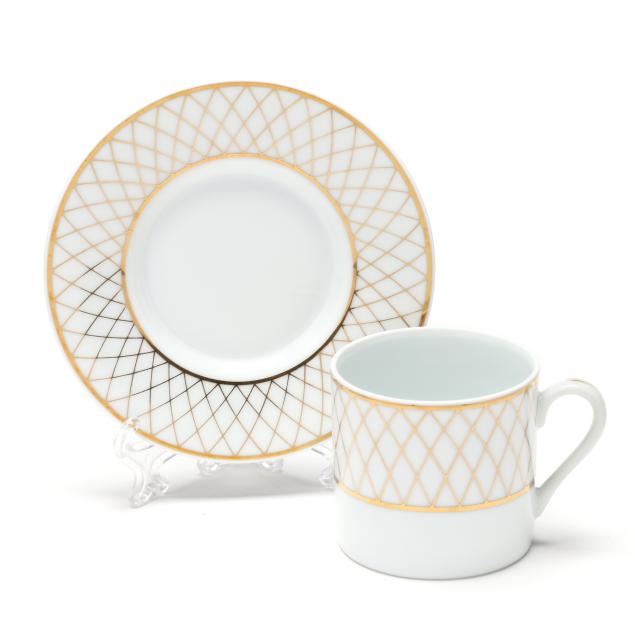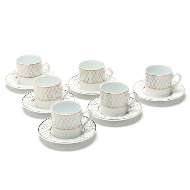 (12) pieces of porcelain with gold lattice trim to include (6) cups (2 3/8 in.) and (6) saucers (5 in.), all marked to underside.