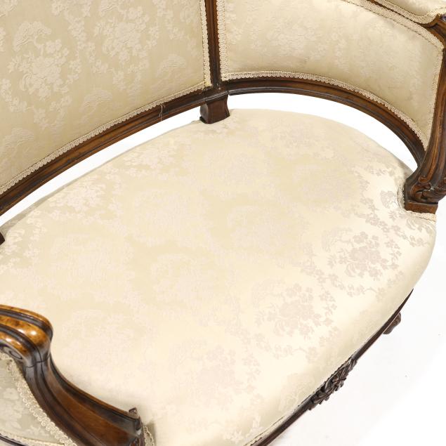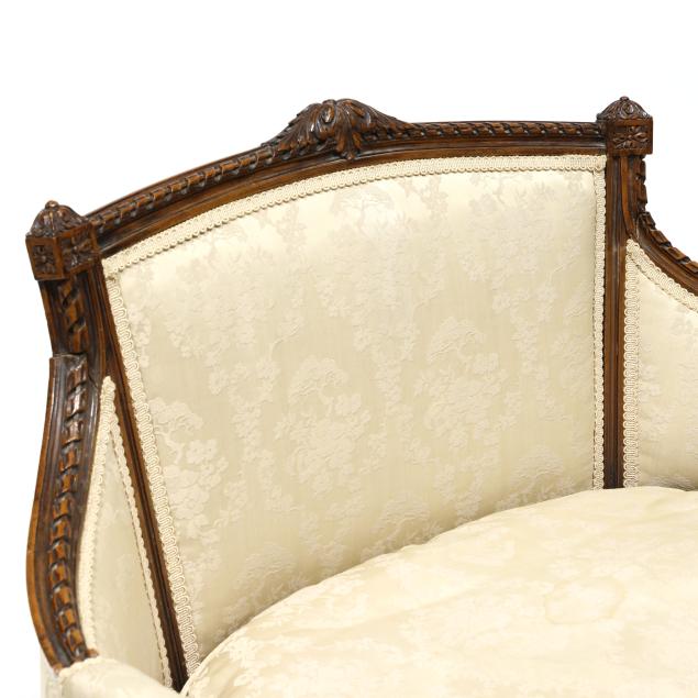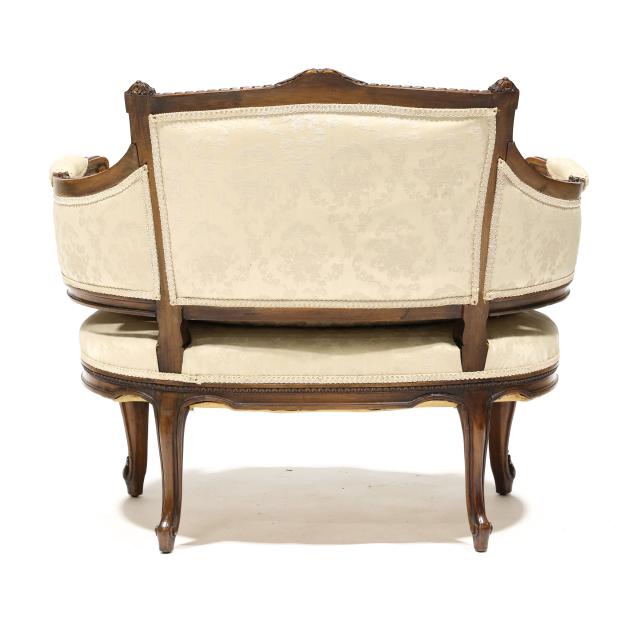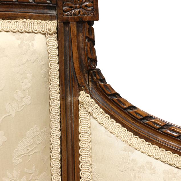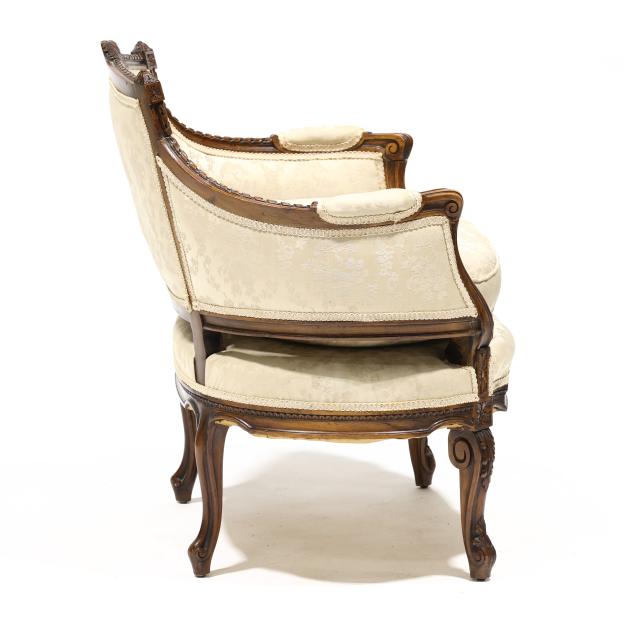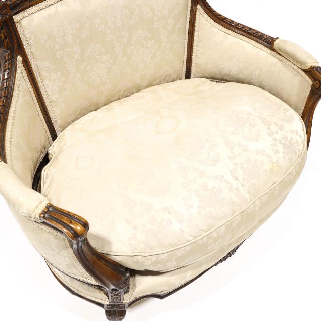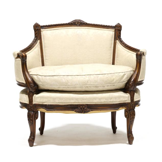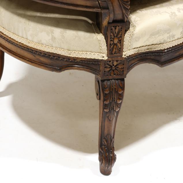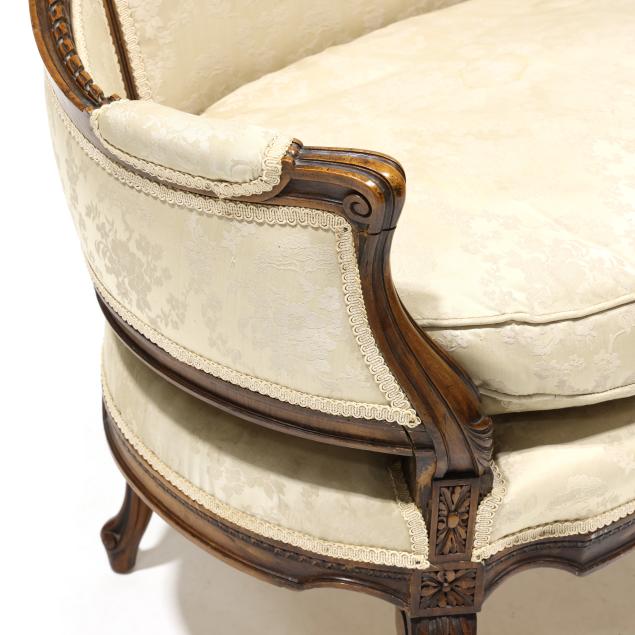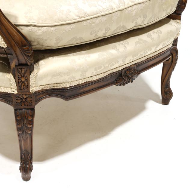 Mid-20th century, carved fruit wood frame, beige floral upholstery, loose down-filled cushion, carved cabriole legs.