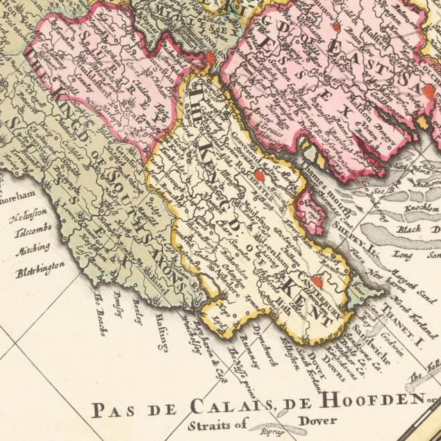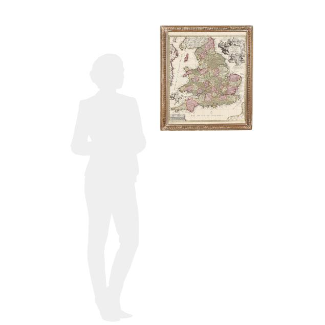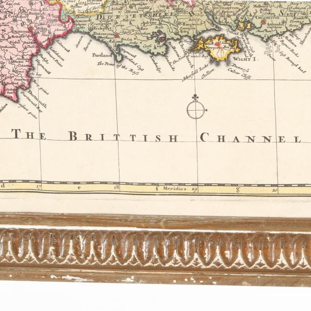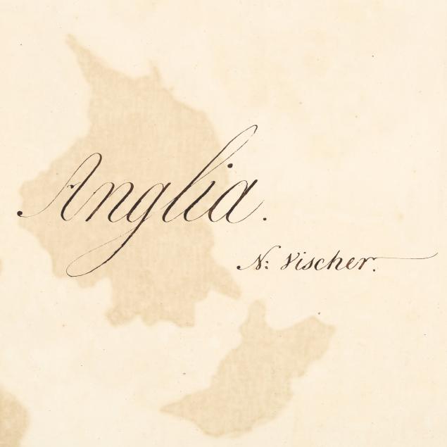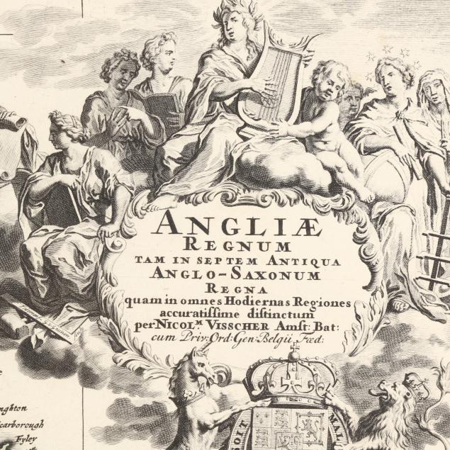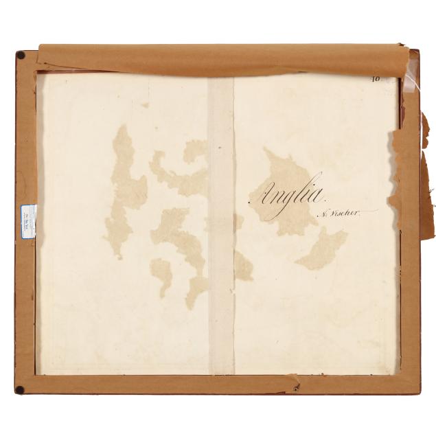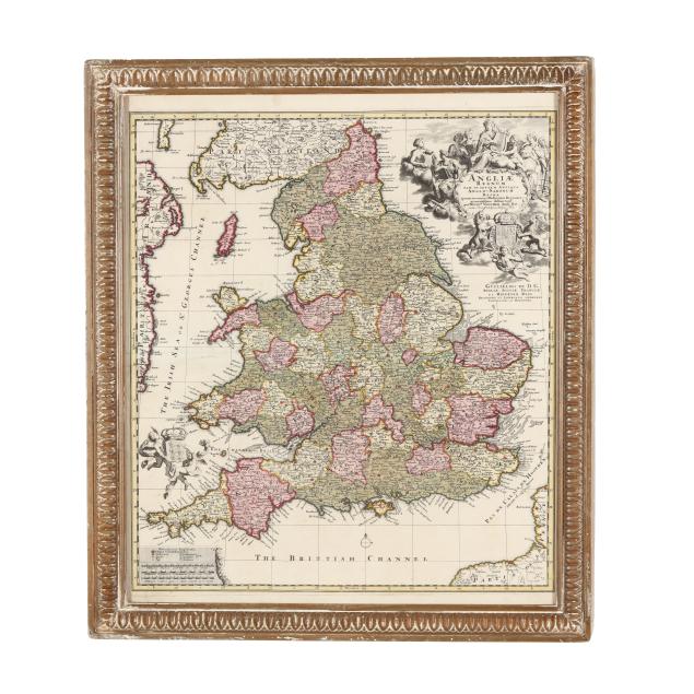 Nicolaes Visscher II. ANGLIAE REGNUM TAM IN SEPTEM ANTIQUA ANGLO-SAXONUM REGNA QUAM IN OMNES HODIERNAS REGIONES ACCURATISSIME DISTINCTUM. Amsterdam, circa first half 18th century. Engraved map with hand-coloring and elaborate title cartouche; depicting England and Wales with parts of Ireland, Scotland, and France; presented in a wooden frame.