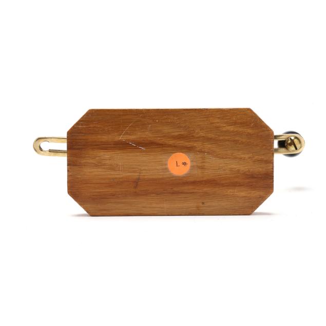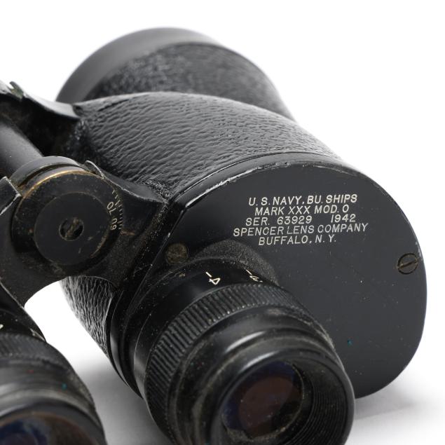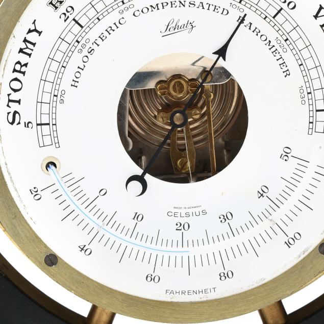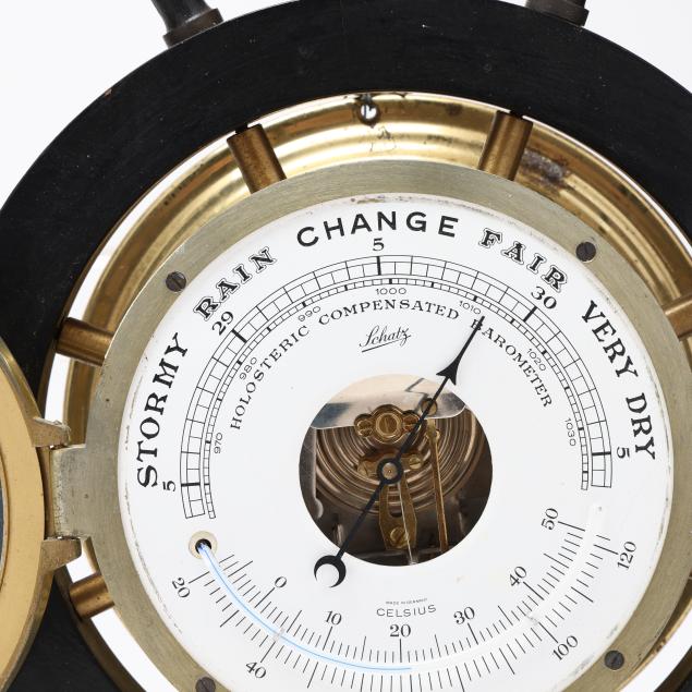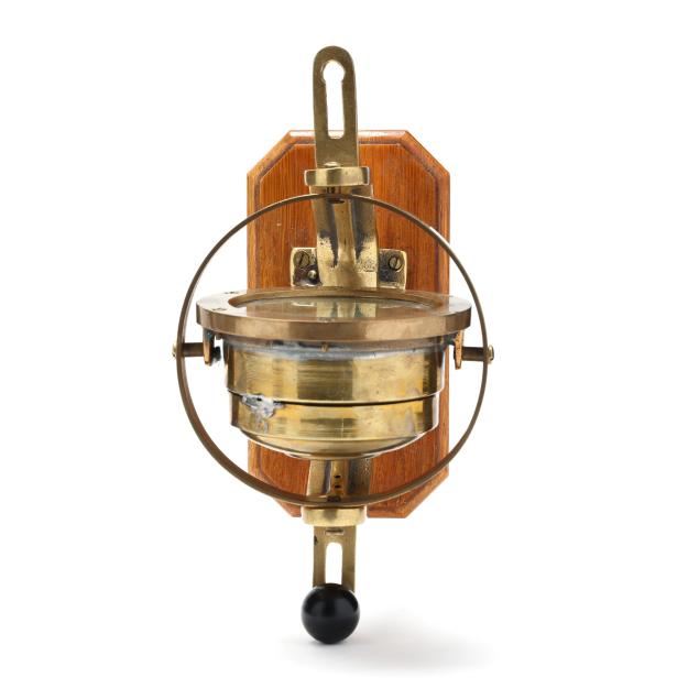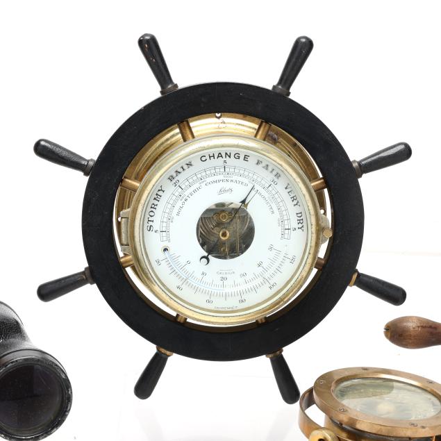 First half 20th century, including a Schatz holosteric compensated barometer, made in Germany, with brass bezel and ebonized wood case in the form of a ship's wheel (13 1/2 in. diameter); a small brass and wood ship's wheel mount (12 1/2 in.); a pair of WWII Navy issued binoculars, signed and dated 1942 by Spencer Lens Co., serial 63929 with conforming leather case (8 1/4 x 9 x 4 1/4 in.); and the fourth a brass nautical binnacle gimbaled compass, wooden base mount, signed to the interior directionals (6 x 9 1/2 x 5 in.).