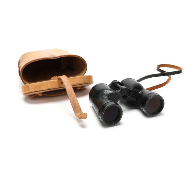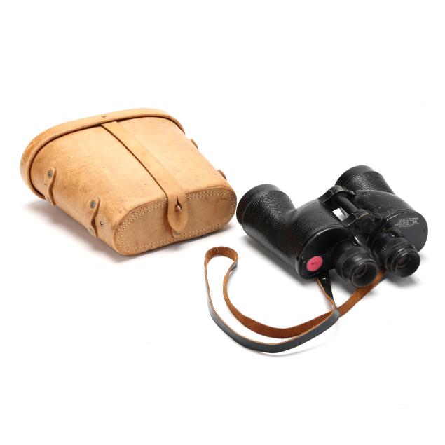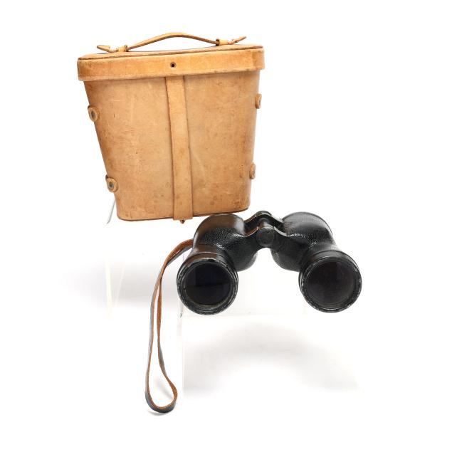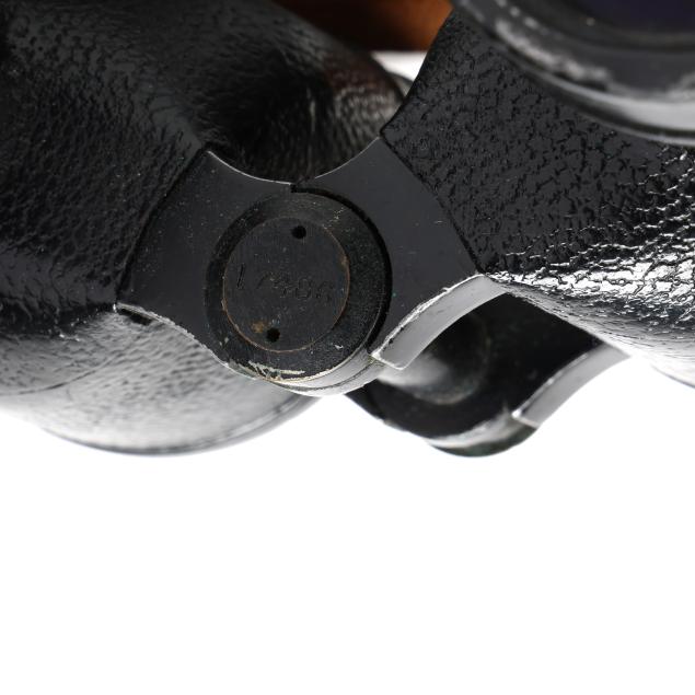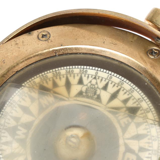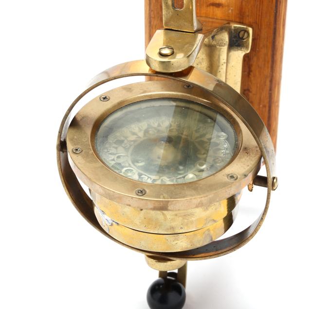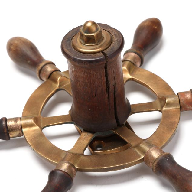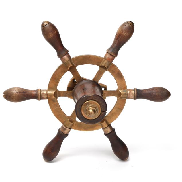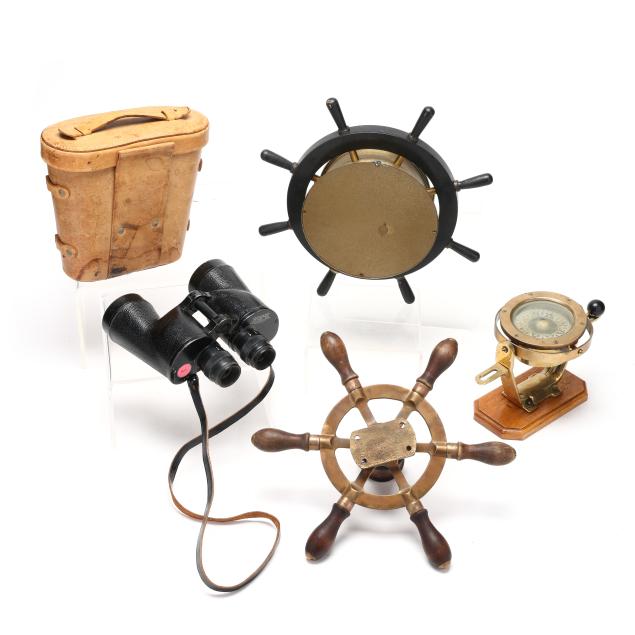 From the Estate of the late Carroll Wayne "Denny" Dennis, Holly Springs, NC Some chips and age checks to central wood mount on the ship's wheel; handling wear to binoculars and case; compass with interior fluid loss and toning, soldering repairs to case underside.