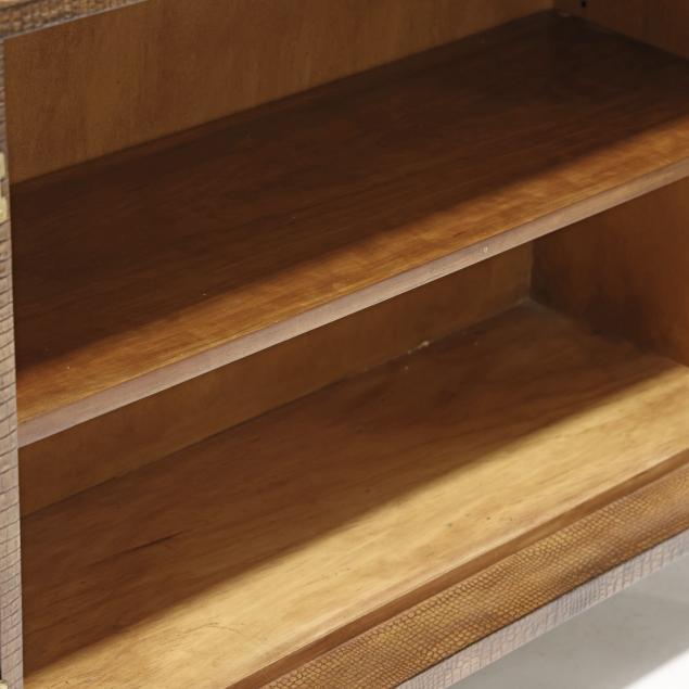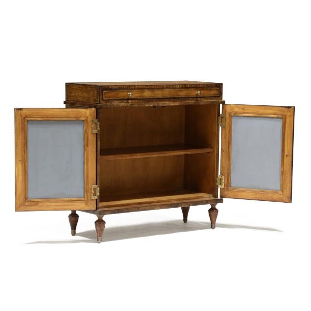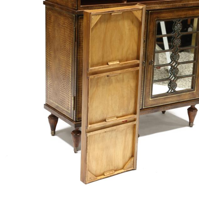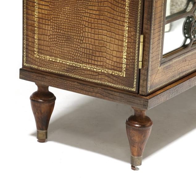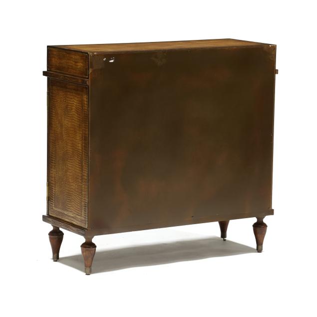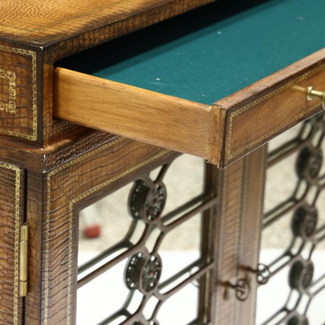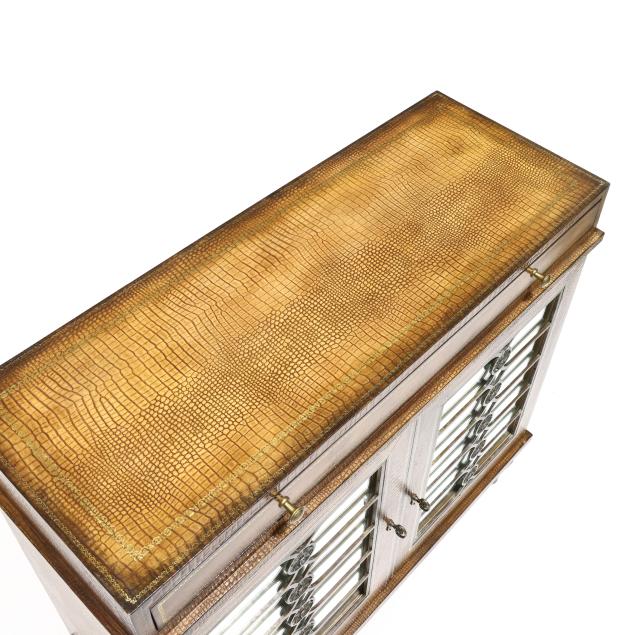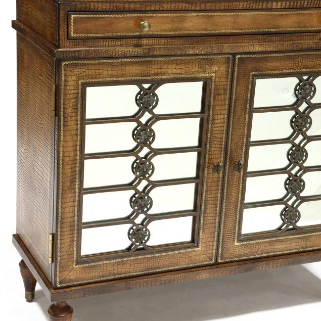 Late 20th century, faux alligator stamped leather-wrapped cabinet with embossed and gilt borders, single drawer over two hinged mirrored panel doors with bronze grilles, shelved interior, turned wood feet with brass caps, labeled.