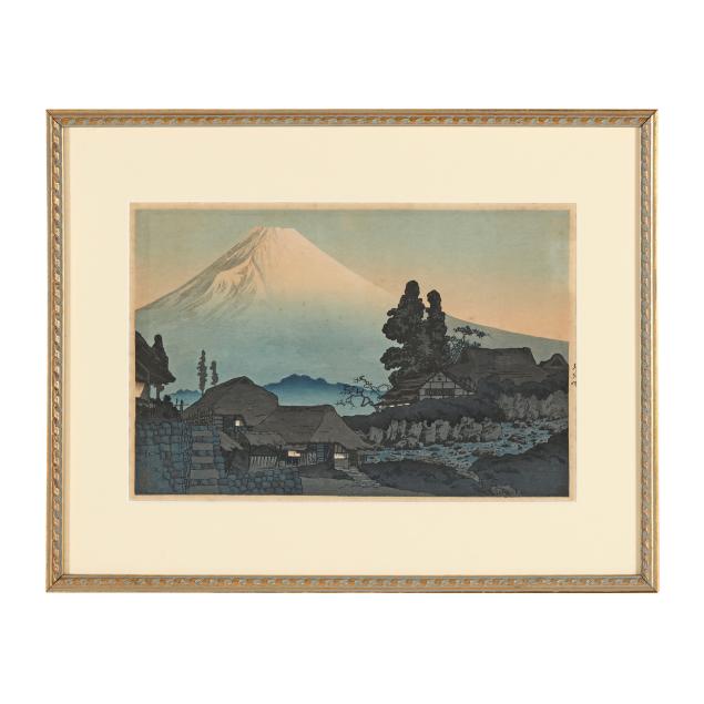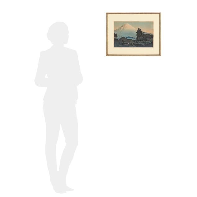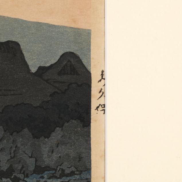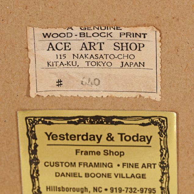 Woodblock print, presented under glass with mat in gilt wood frame.