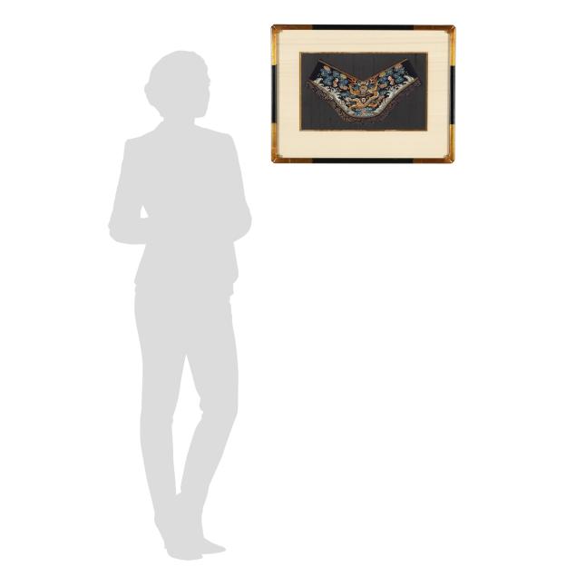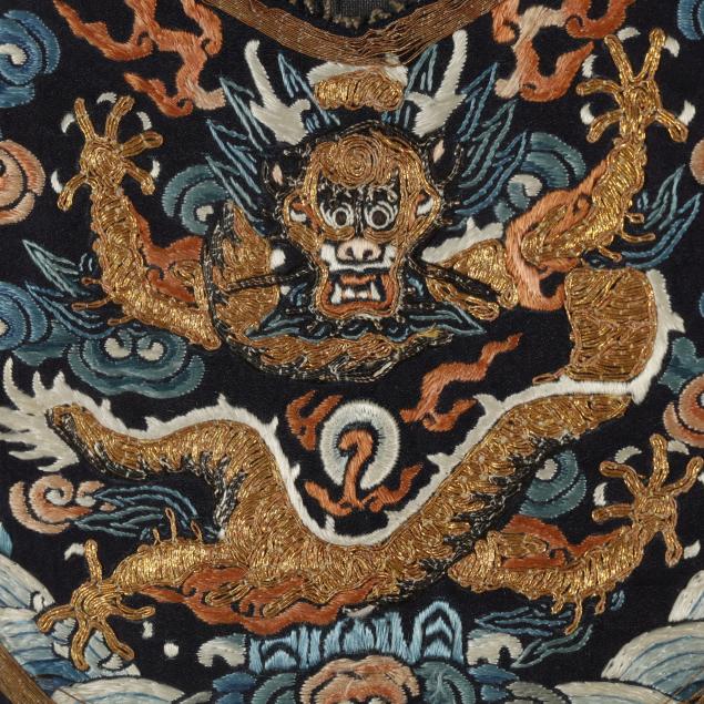 Late 19th century, beautifully embroidered cuff from an imperial dragon robe with a frontal facing five claw dragon rendered in gold wrapped thread with fire bands and swirling clouds behind him, presented under glass over black silk ground, with double mats in a black and gilt wood frame with dimpled corners.