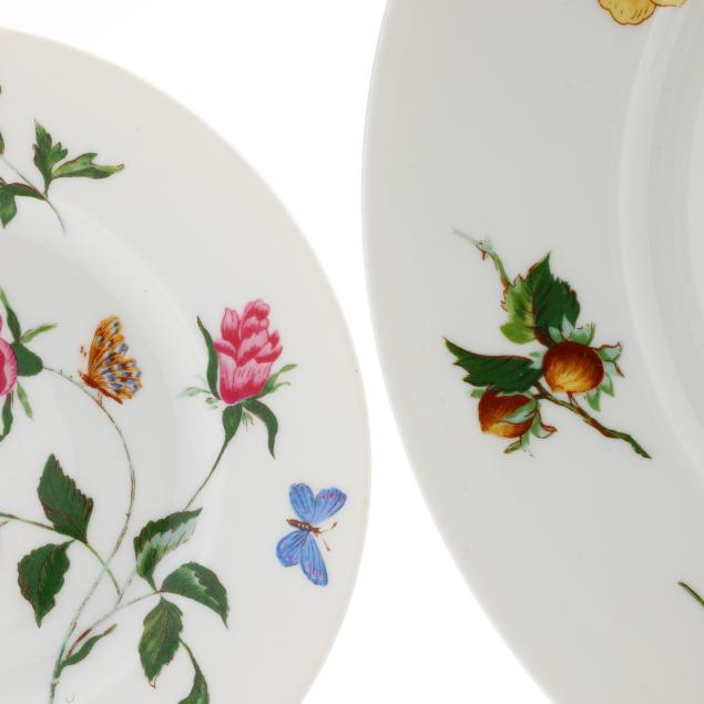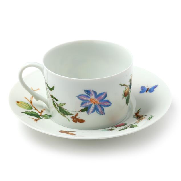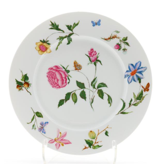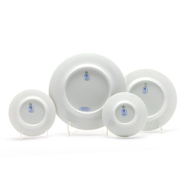 (39) pieces, France, late 20th century, patterned after an 18th-century floral design of the Compagnie Française des Indes, to include (8) dinner plates (10 7/8 in.); (8) luncheon (8 3/4 in.); (8) bread and butter (6 1/2 in.); (7) cups (and (8) saucers (6 1/4 in.), all marked to underside.
