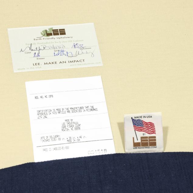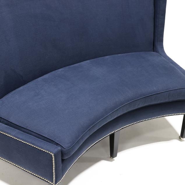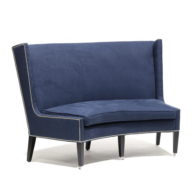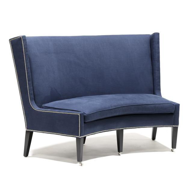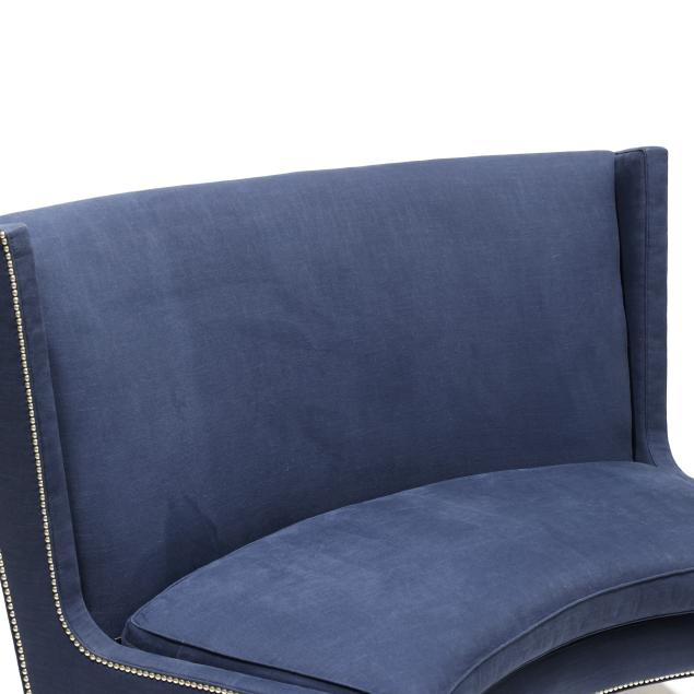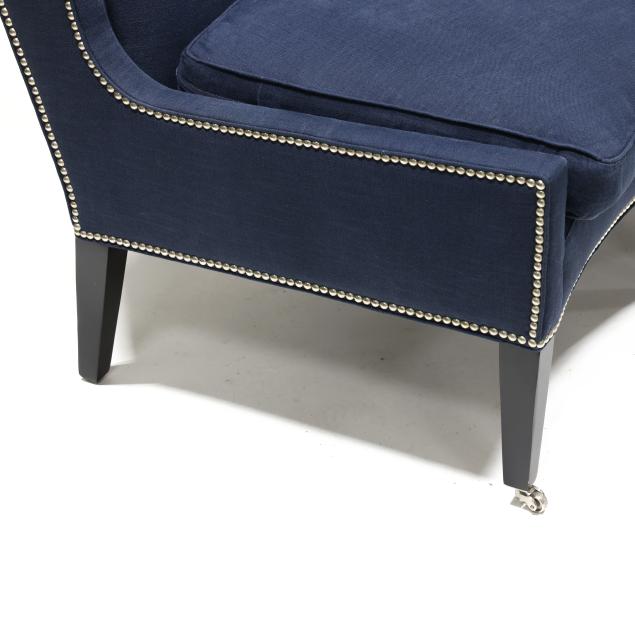 Contemporary, navy upholstery with silver tone tack trim, loose seat cushion, ebonized tapered legs with silver tone casters, labeled.