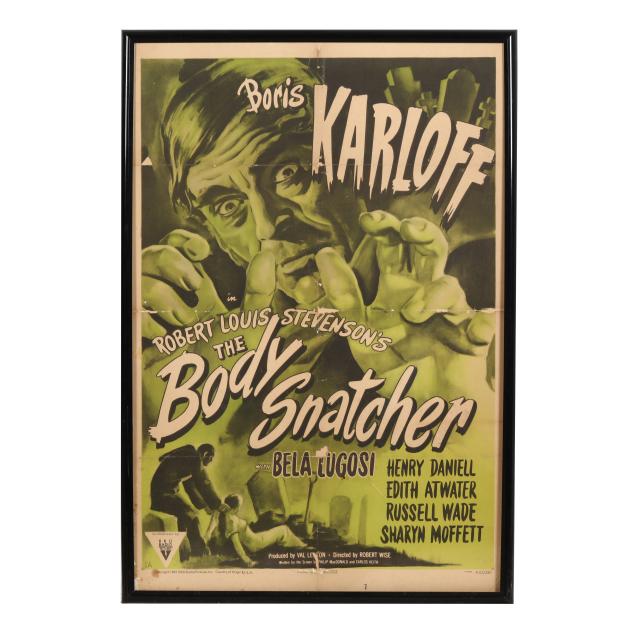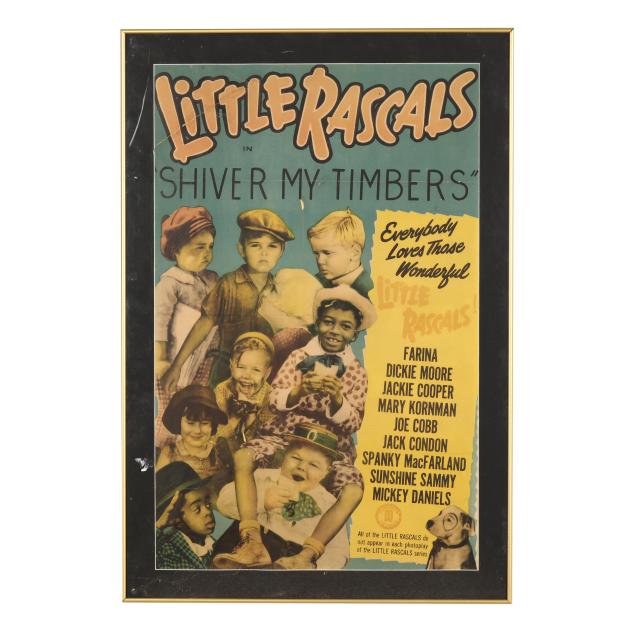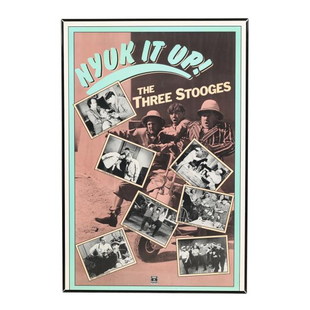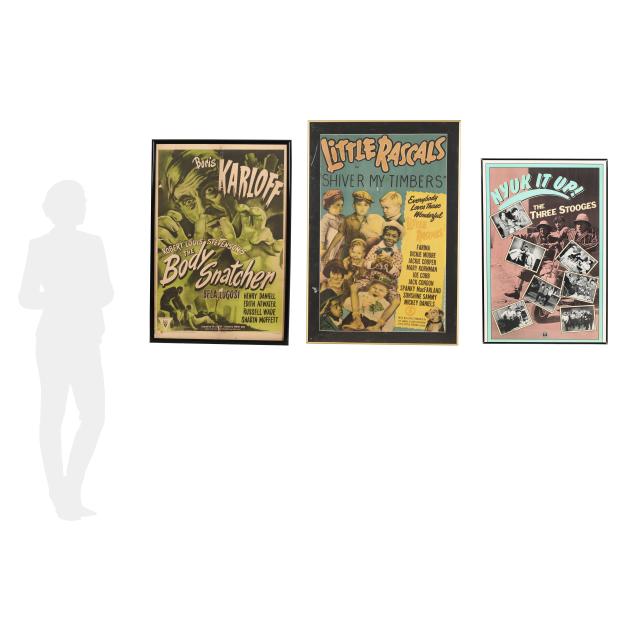 The first, The Little Rascals in Shiver My Timbers, circa 1931, chromolithographic poster, published by monogram pictures, matted and framed below glass (Frame dimensions 43 1/2 x 29 1/2 in.); the second, The Three Stooges, Nyuk It Up!, circa 1980s, screenprint and offset lithographic poster, published by Columbia Pictures, framed below Plexiglass (Frame dimensions 40 1/2 x 27 1/8 in.); and The Body Snatcher, chromolithographic poster, circa 1952, starring Boris Karloff, published by RKO Radio Pictures for the movie's re-release, framed below Plexiglass (Frame dimensions 41 x 28 in.)