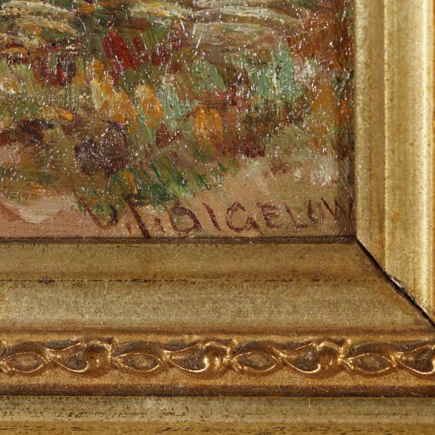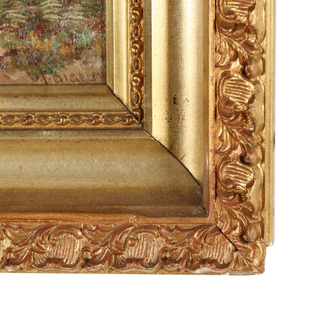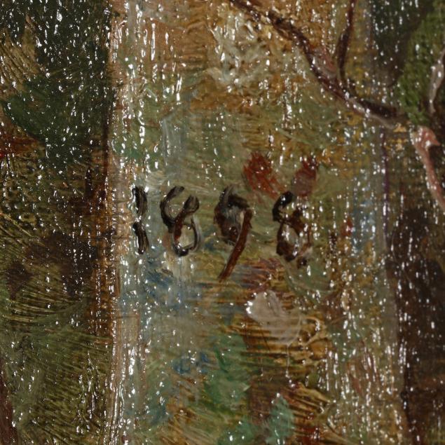 Oil on artist board, 1898, signed at lower left, dated to the tree, retaining label to verso, presented in a gilt frame.