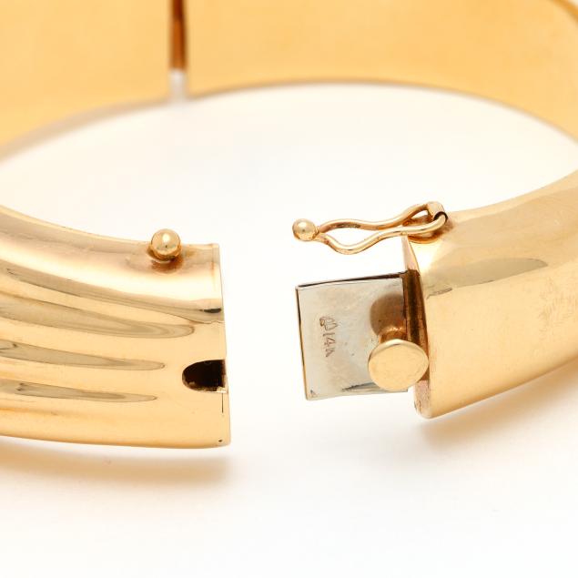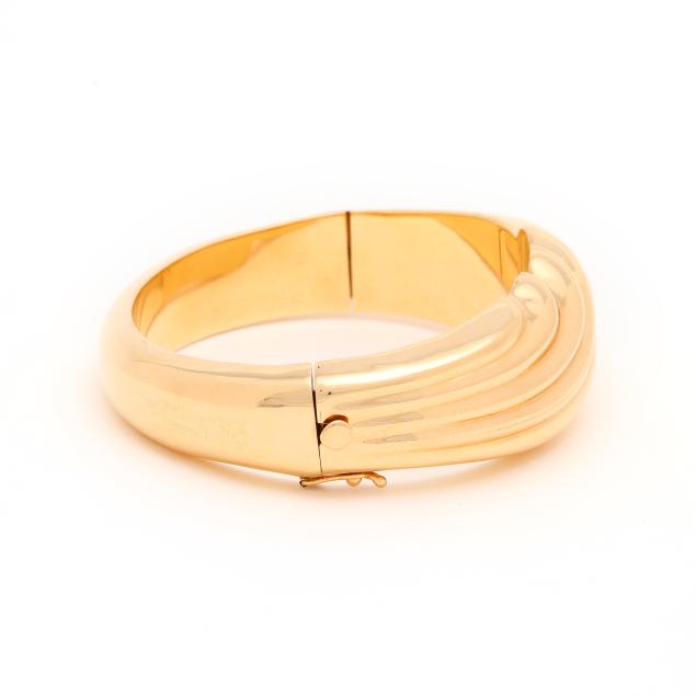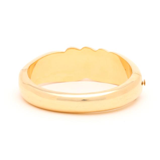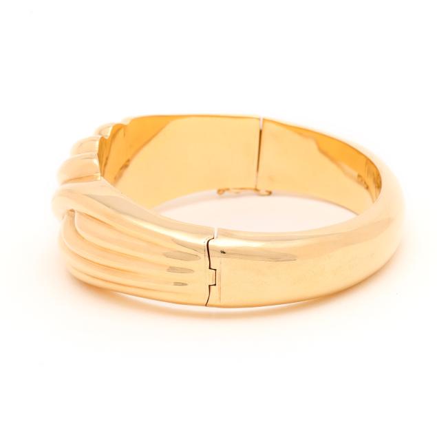 Hollow hinged high polish bangle in a knot motif, completed with a box clasp with figure eight safety, stamped 14K.