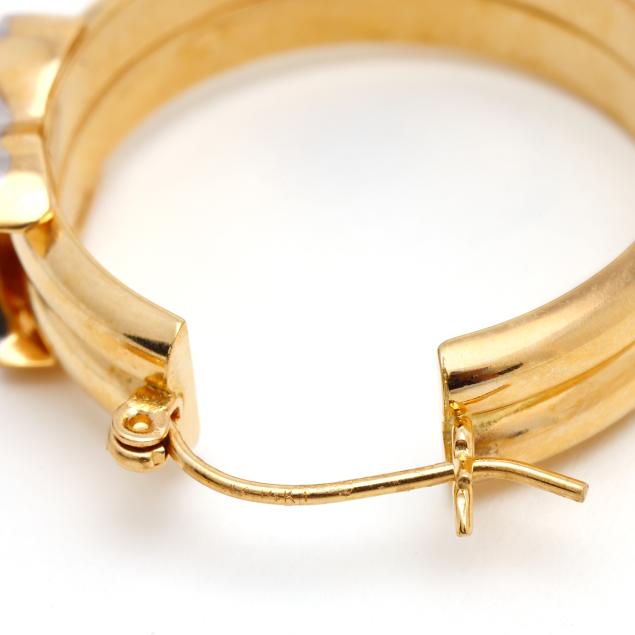 Double hoop design earrings, the front with an applied white gold X motif set with single cut diamond melee, completed with hinged posts stamped 14KT, hoops testing 14KT.
