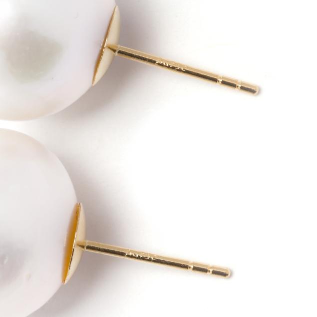 The round cultured South Sea pearls (14.2mm; 14.3mm) completed with gold posts, stamped Au750.