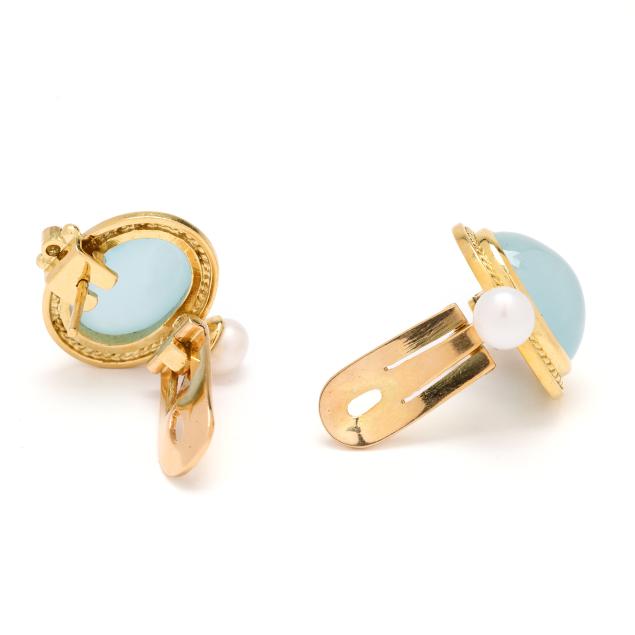 Horizontally bezel set oval cabochon cut gray chalcedony (13.65 x 9.63mm) within a rope twist border, with collet set diamond surmount (1.75mm) with button pearl drop, completed with convertible folding posts and clip backs, stamped 18K.