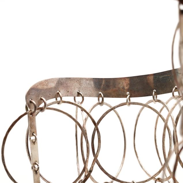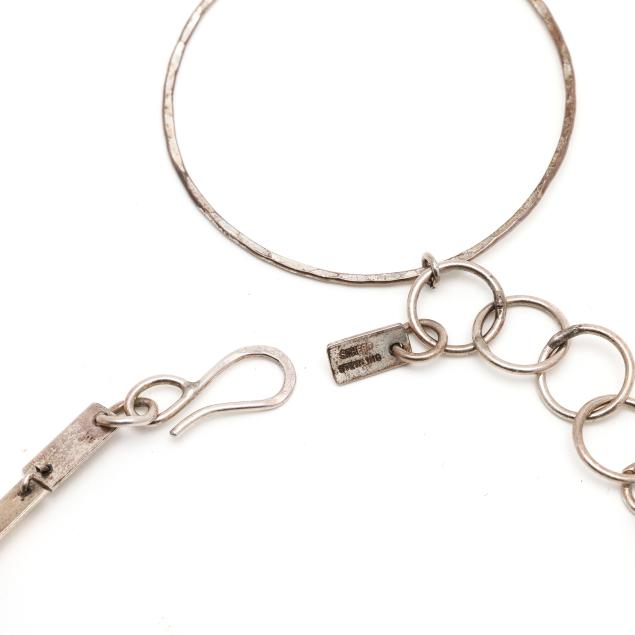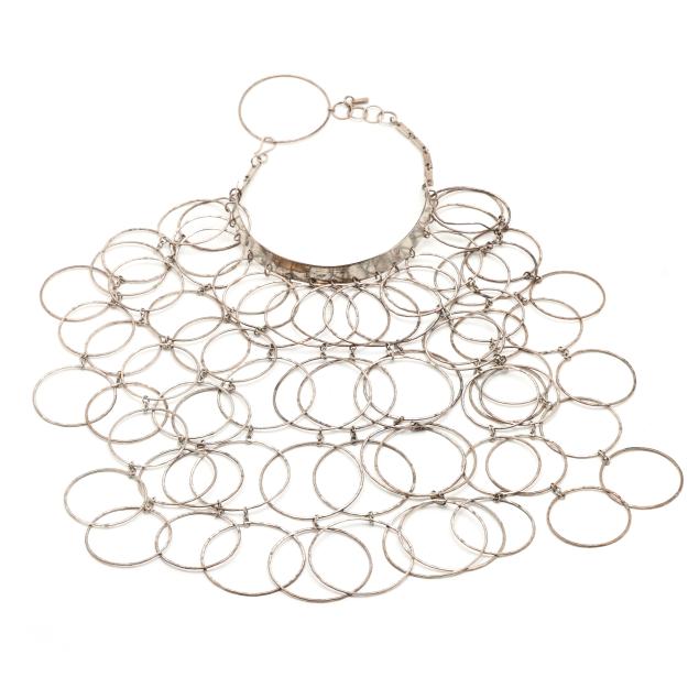 Collar top suspending multiple lengths of hand-hammered silver rings to form a bib design, completed with a hook and eye clasp, with tag stamped Scherr / Sterling, and signed to inside of collar.