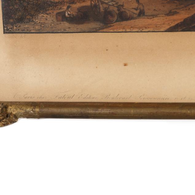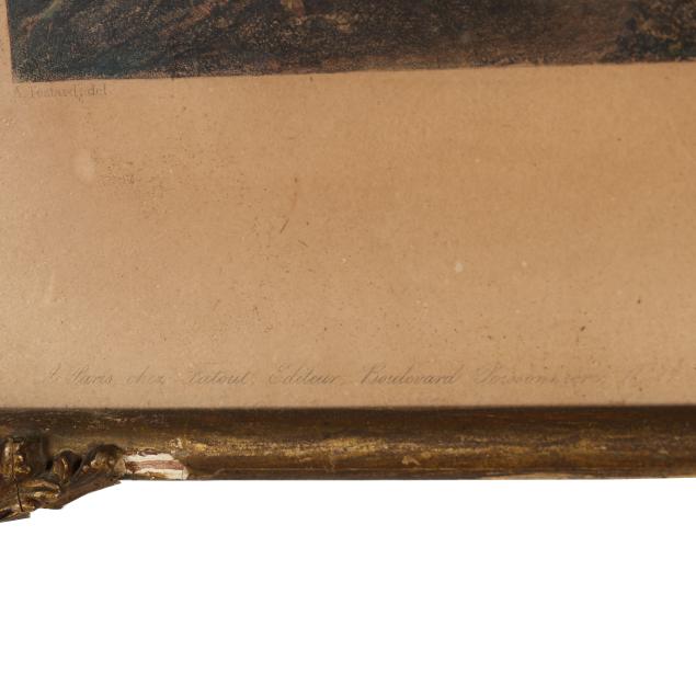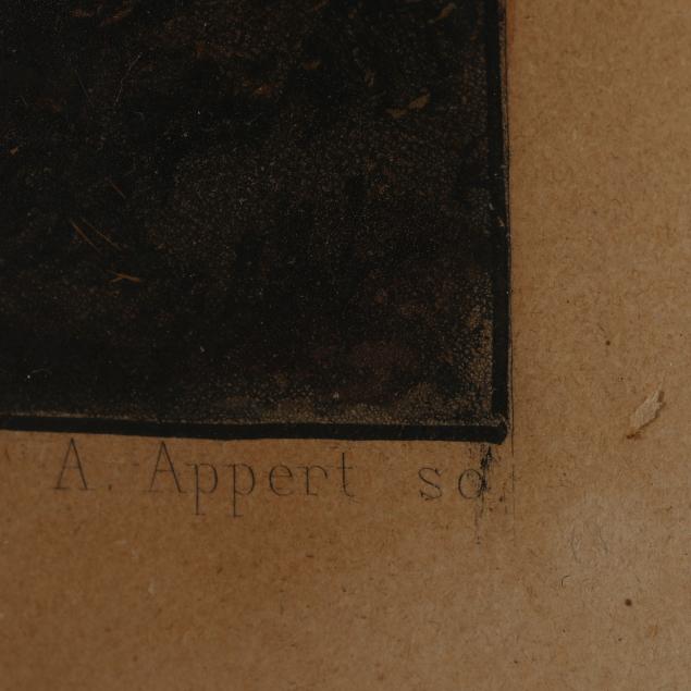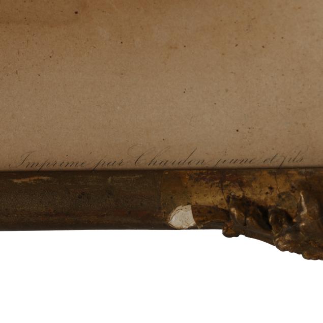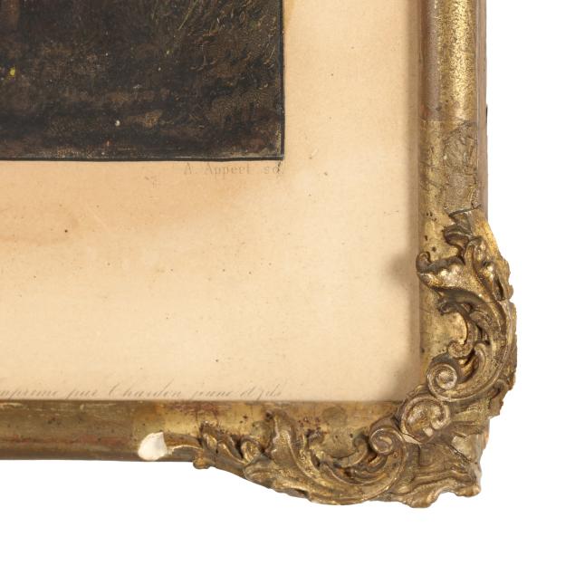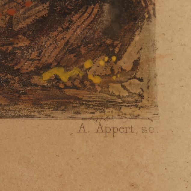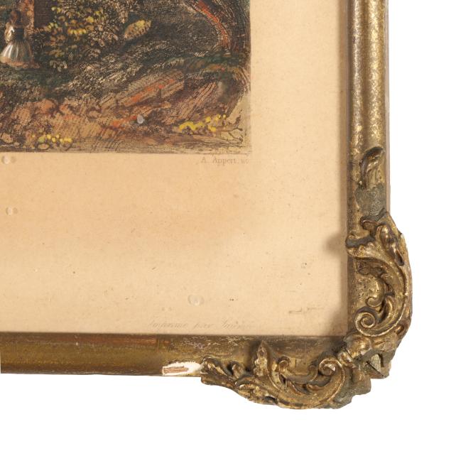 Etching and aquatint with hand-coloring and gouache embellishments, mid 19th century, engraved by A. Appert (French, 1840-1867), presented in uniform giltwood framing below glass.